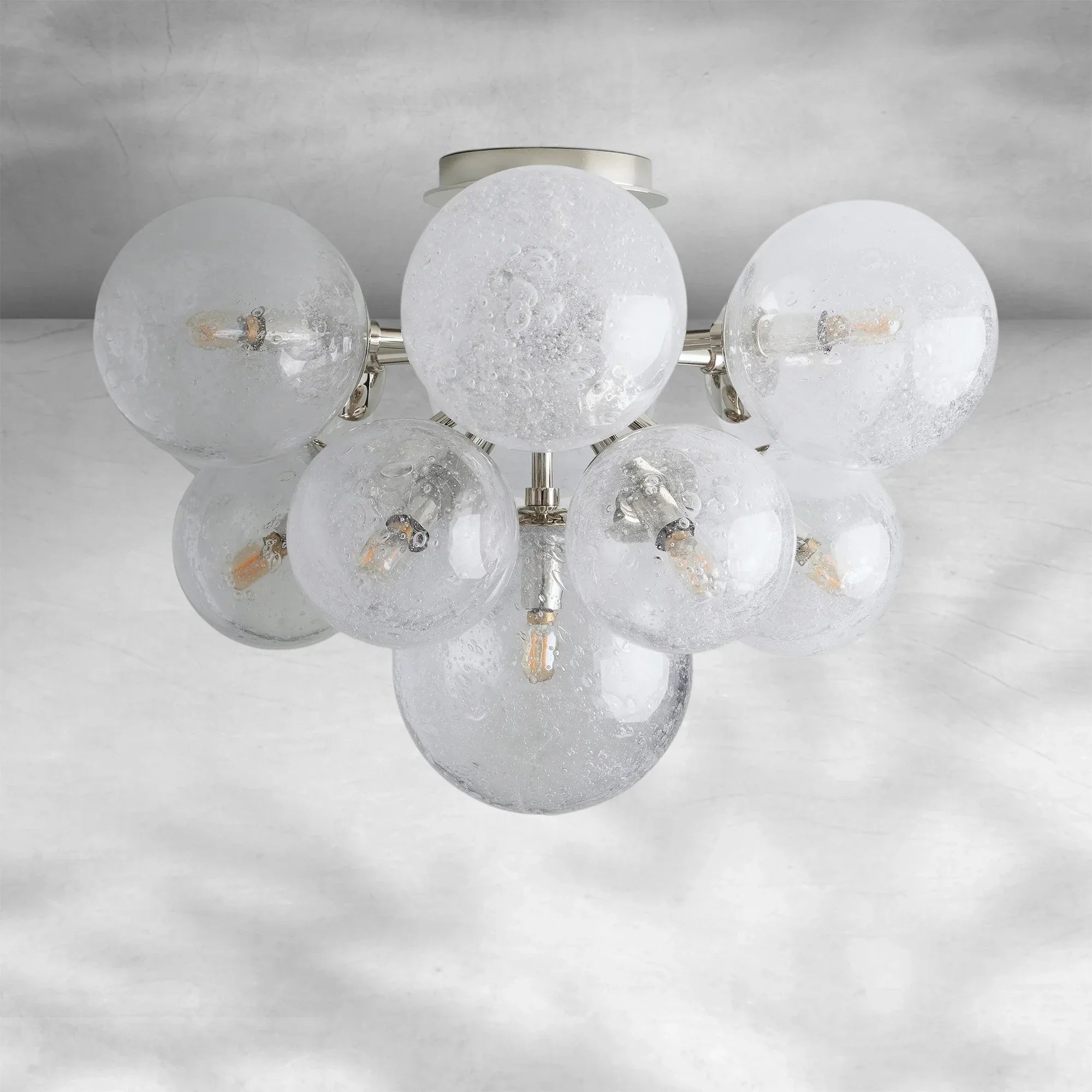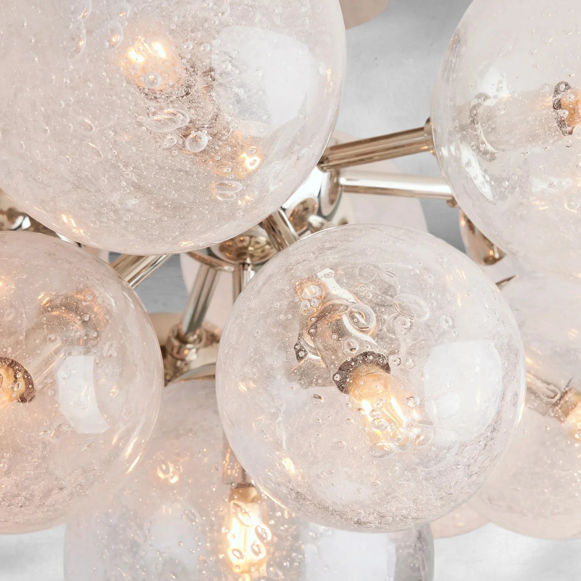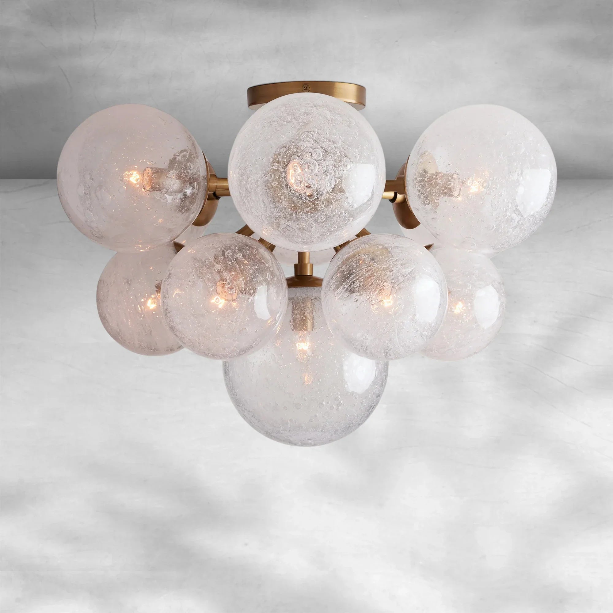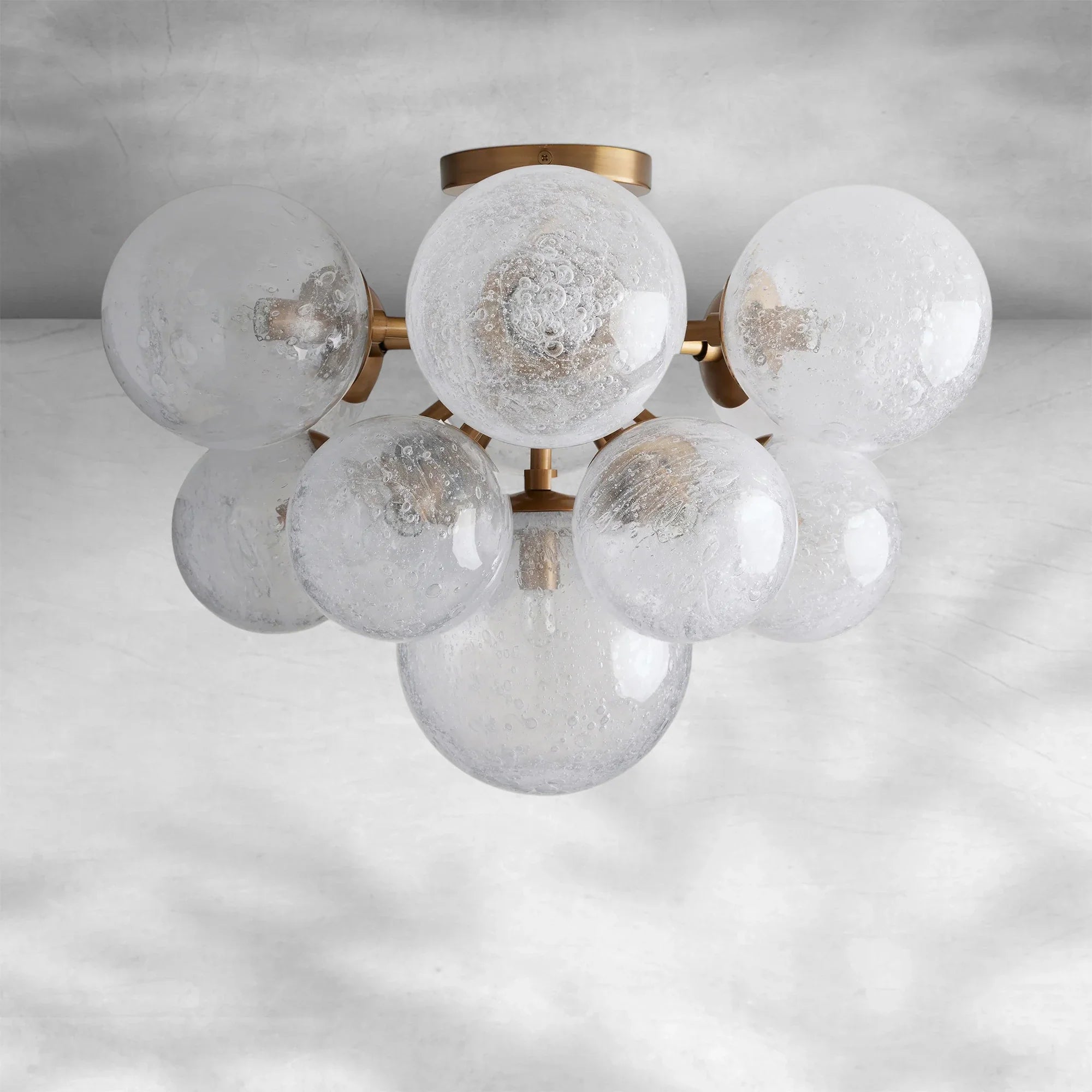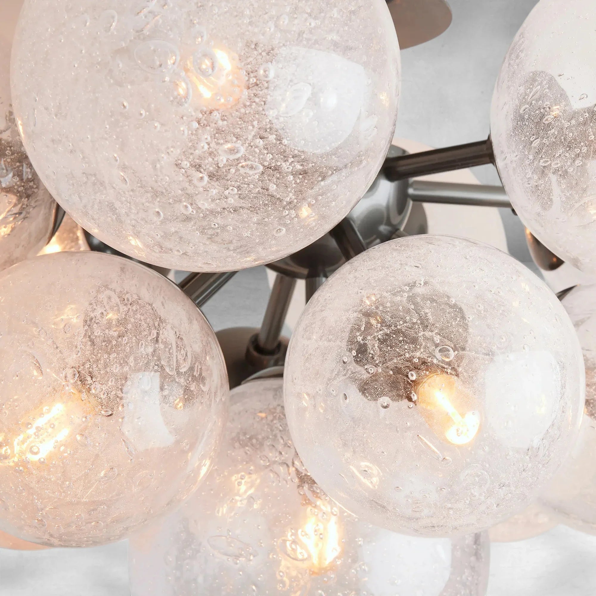 - A fusion of rustic charm and industrial design, our Mandoza Collection features stunning silhouettes and mixed-material style. Each individual glass globe is hand-blown with a reactive technique, creating a dense network of bubbles under a thick layer of glass. The result has a striking effect when illuminated from within, casting light from every angle.