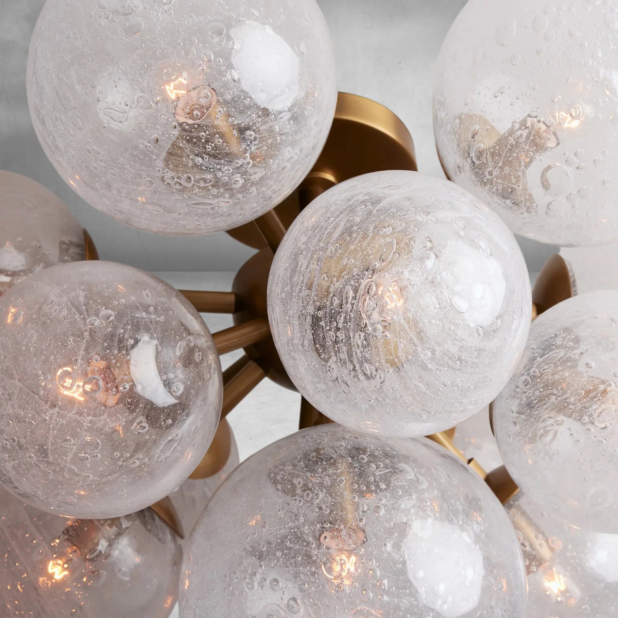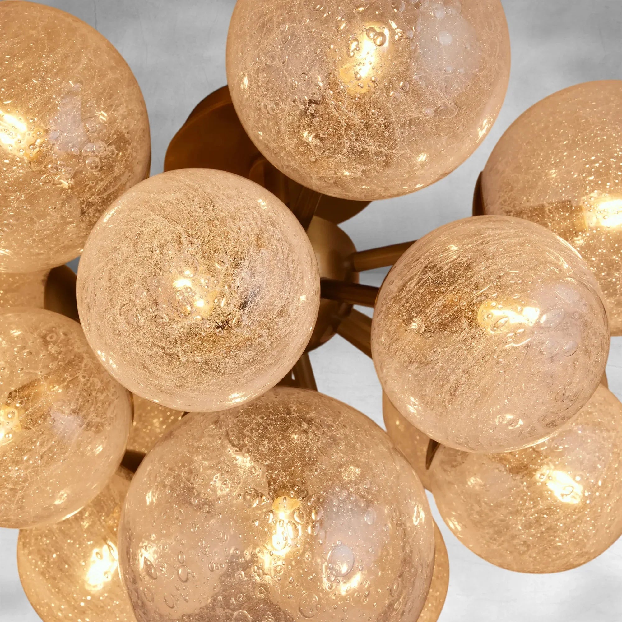 - Crafted from burnished brass-finished steel and aluminum with hand-blown glass globes.
