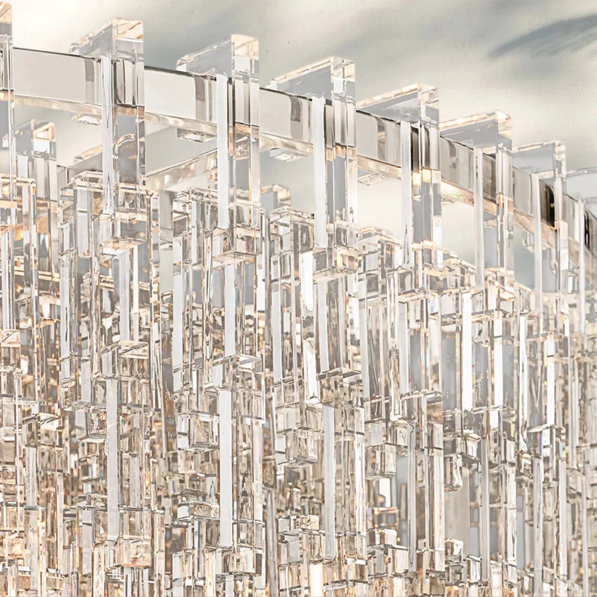 This collection of lamps, pure and minimalist in style, features stunning, interlocking open and closed chains designed with crystalline crystals. The stylized chains are suspended without wires, creating an elegant cascade of shimmering light.