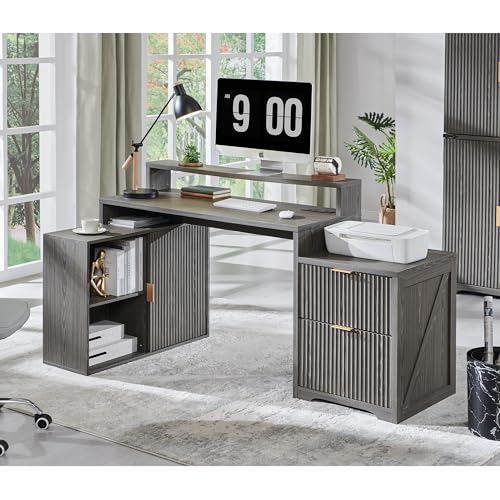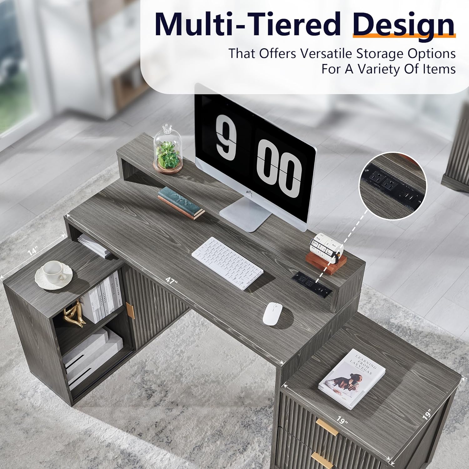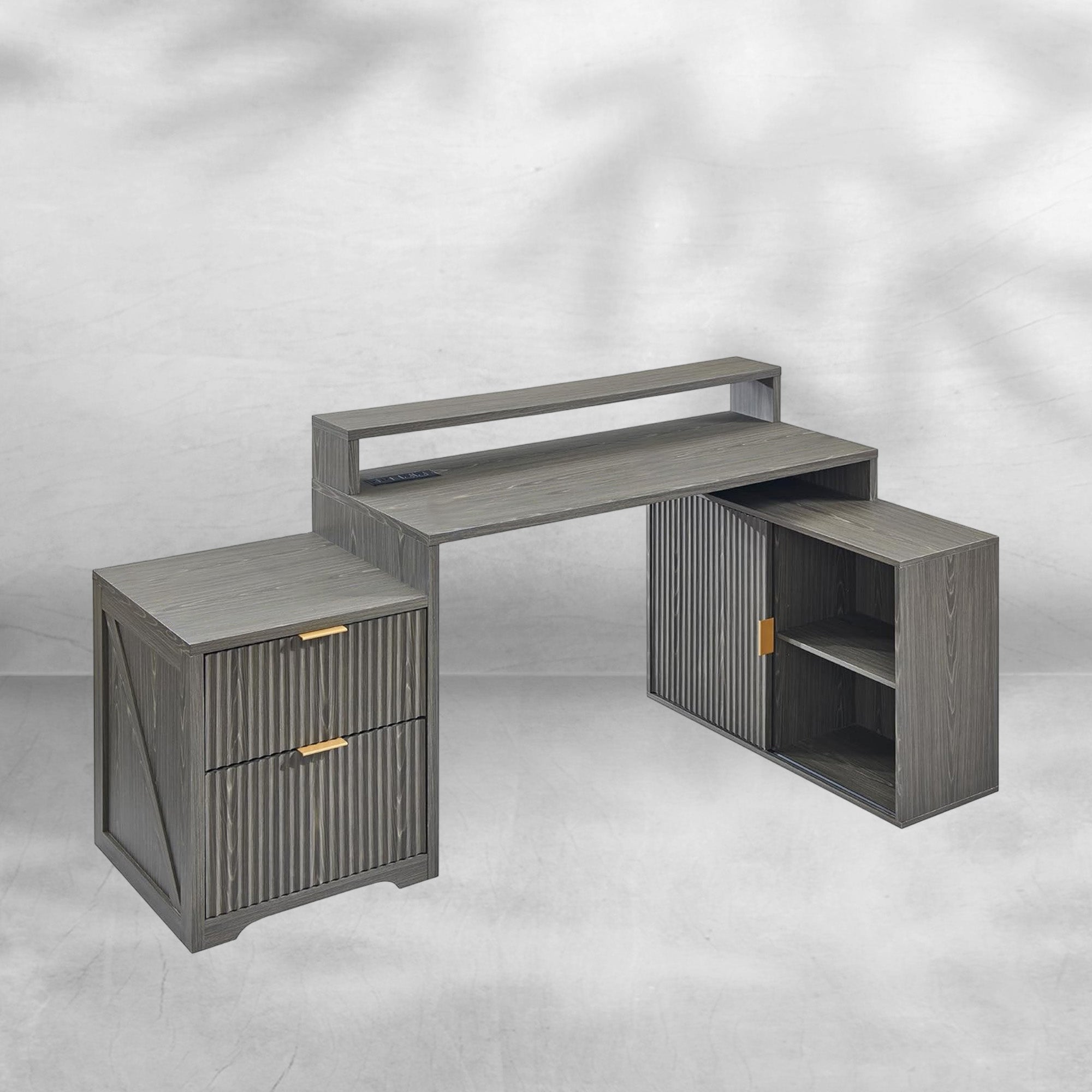 Elevate your workspace with this modern L-shaped desk. It features a fluted design, a storage cabinet, and drawers that blend functionality with style. Built-in power outlets keep your devices charged and ready, while the spacious surface provides ample room for all your essentials. This desk is perfect for creating an organized and efficient home office.