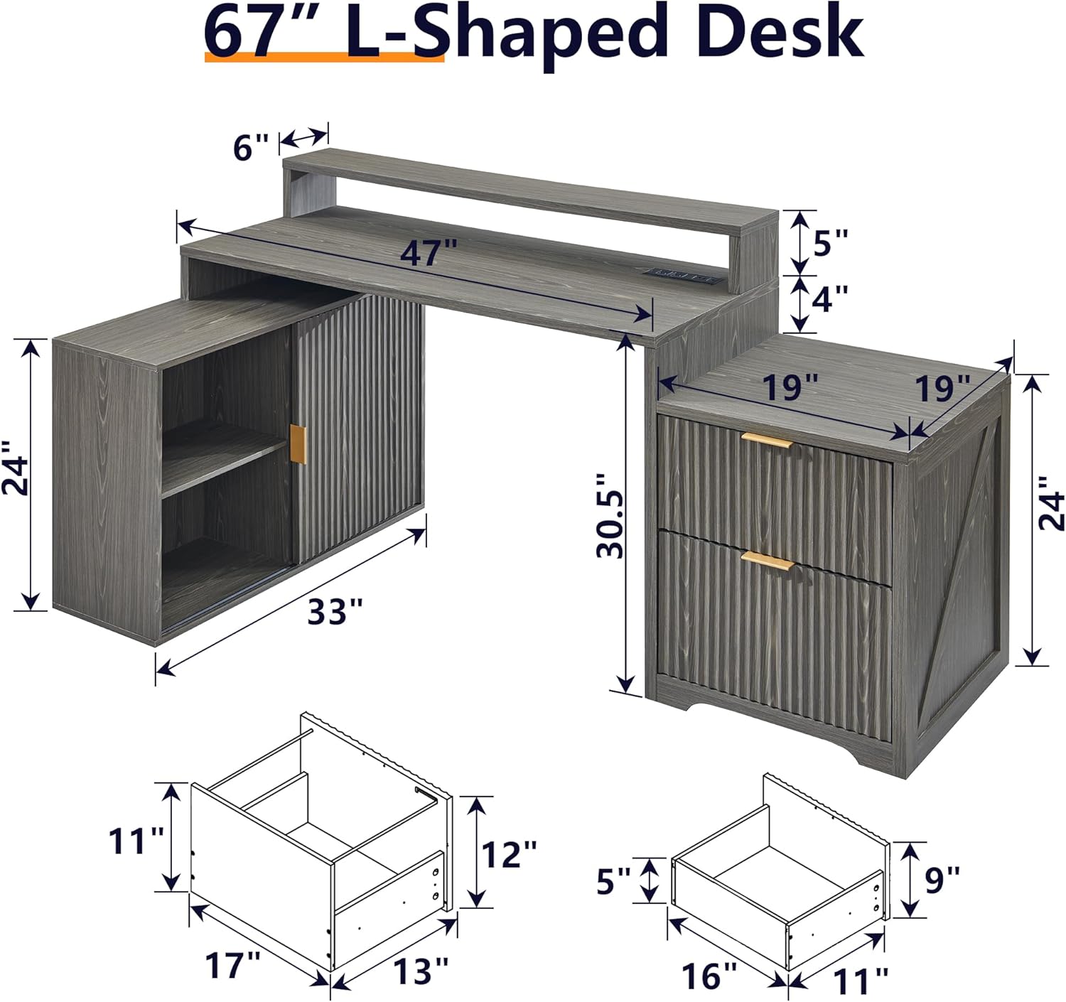 Modern 67" L-Shaped Desk with Storage & Power Outlets