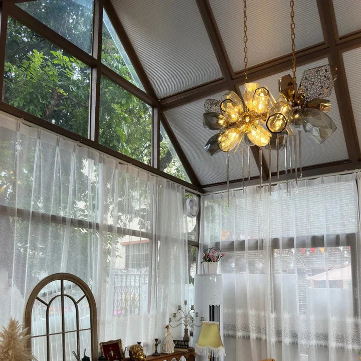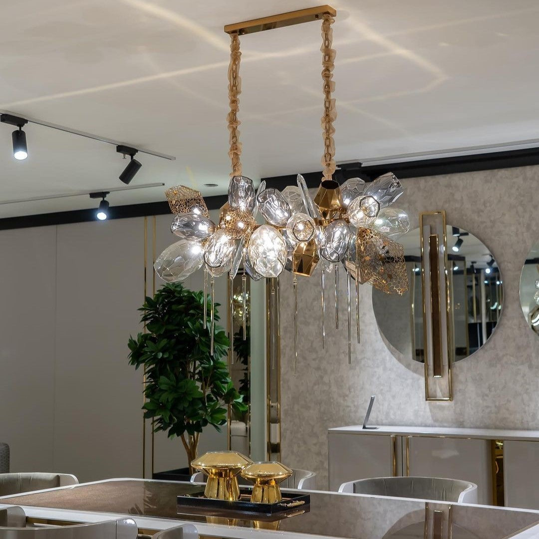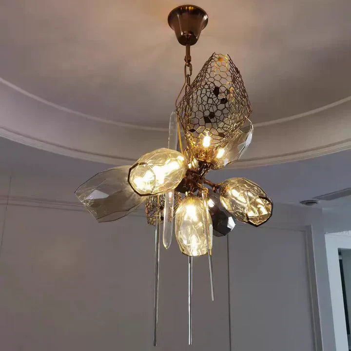 This very unique eye-catching light fixture has creative design and it is designed with superior quality crystal and glass. A combination of magnificent proportions, consisting of a superior demonstration of craftsmanship that combines glass shards, hand-blown and carved, angular Murano glass globes, topped with a delicious bronze honeycomb design. A lighting masterpiece that boasts a myriad of varying incandescent reflections, set to uplift the ambiance of any surroundings it is placed in.