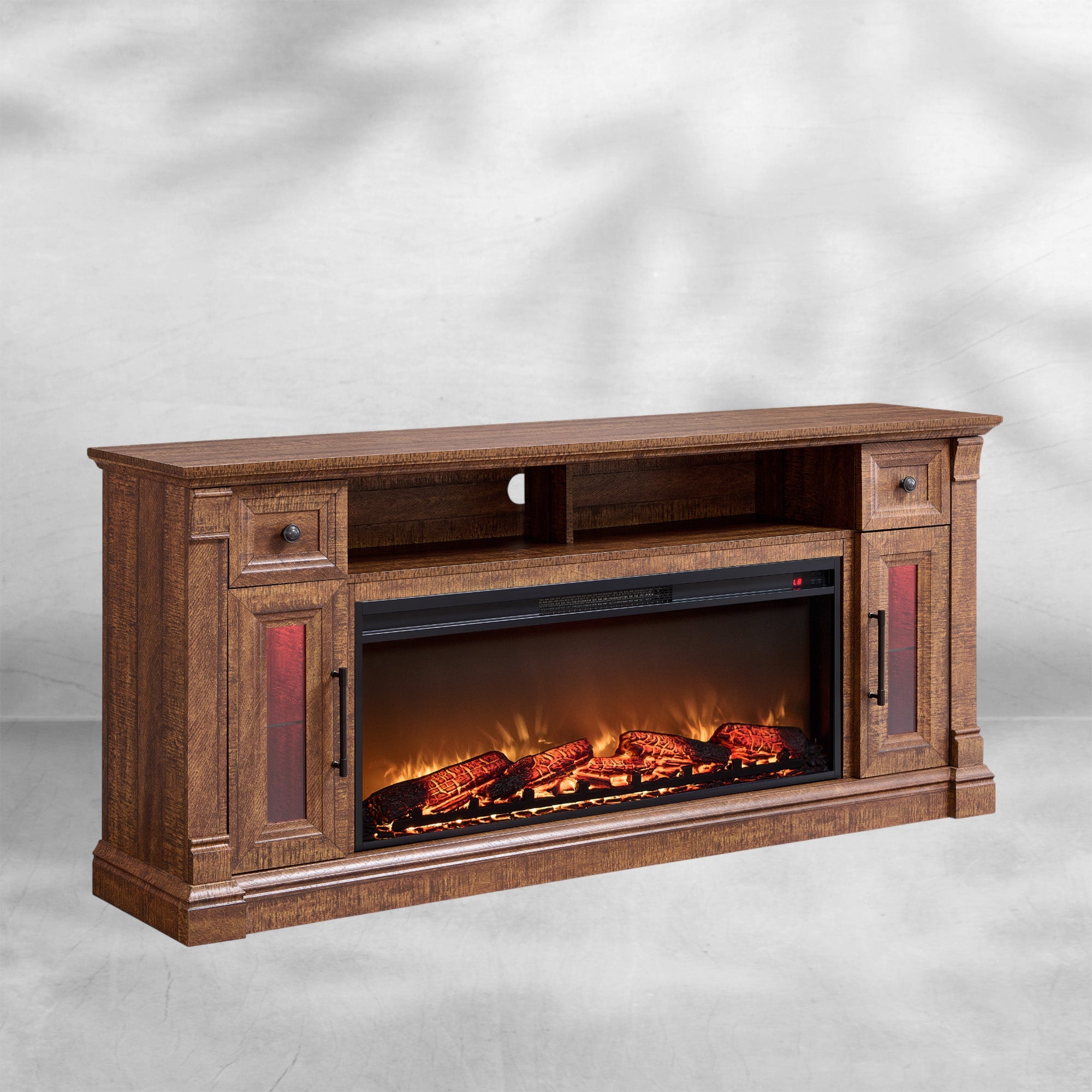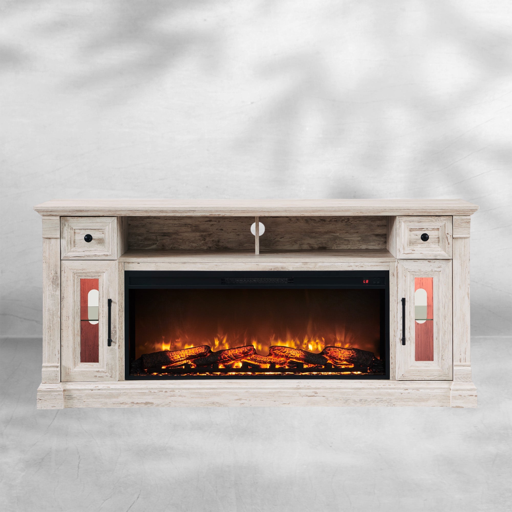 Elevate your living space with our farmhouse-style fireplace TV stand, designed to accommodate TVs up to 80 inches. This entertainment center features a 42-inch electric fireplace and integrated LED lights, setting the perfect ambiance. Enjoy ample storage with drawers and cabinets, ideal for organizing your living room essentials. Combining rustic charm with modern functionality, it's a stylish addition to any home.