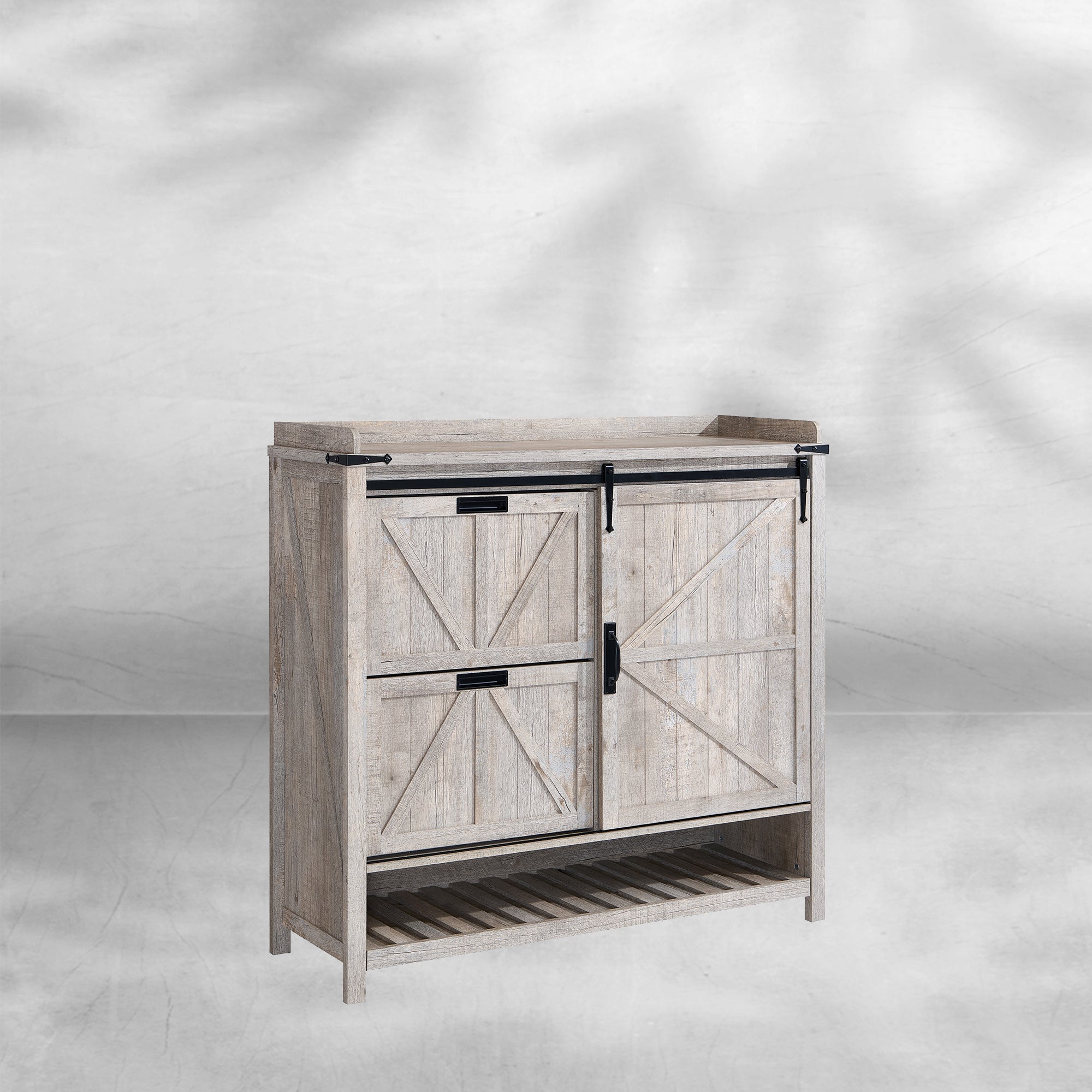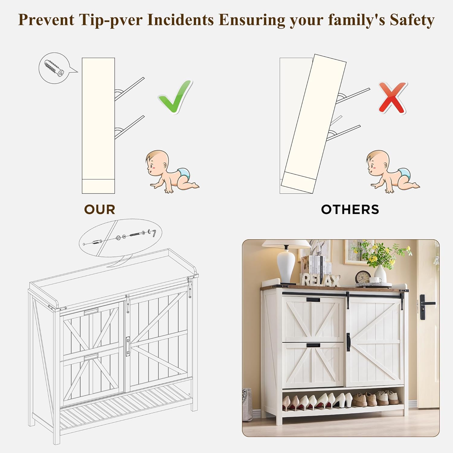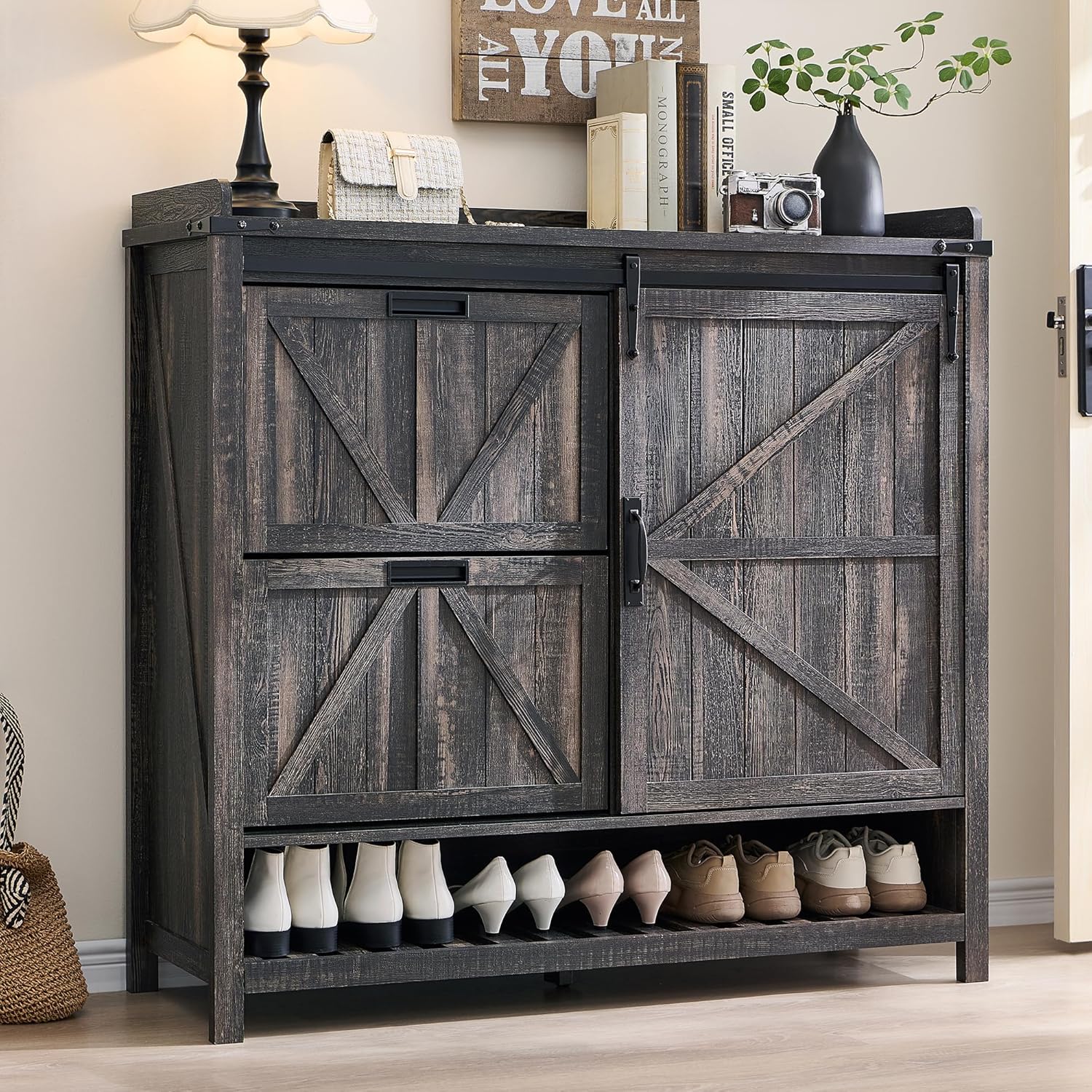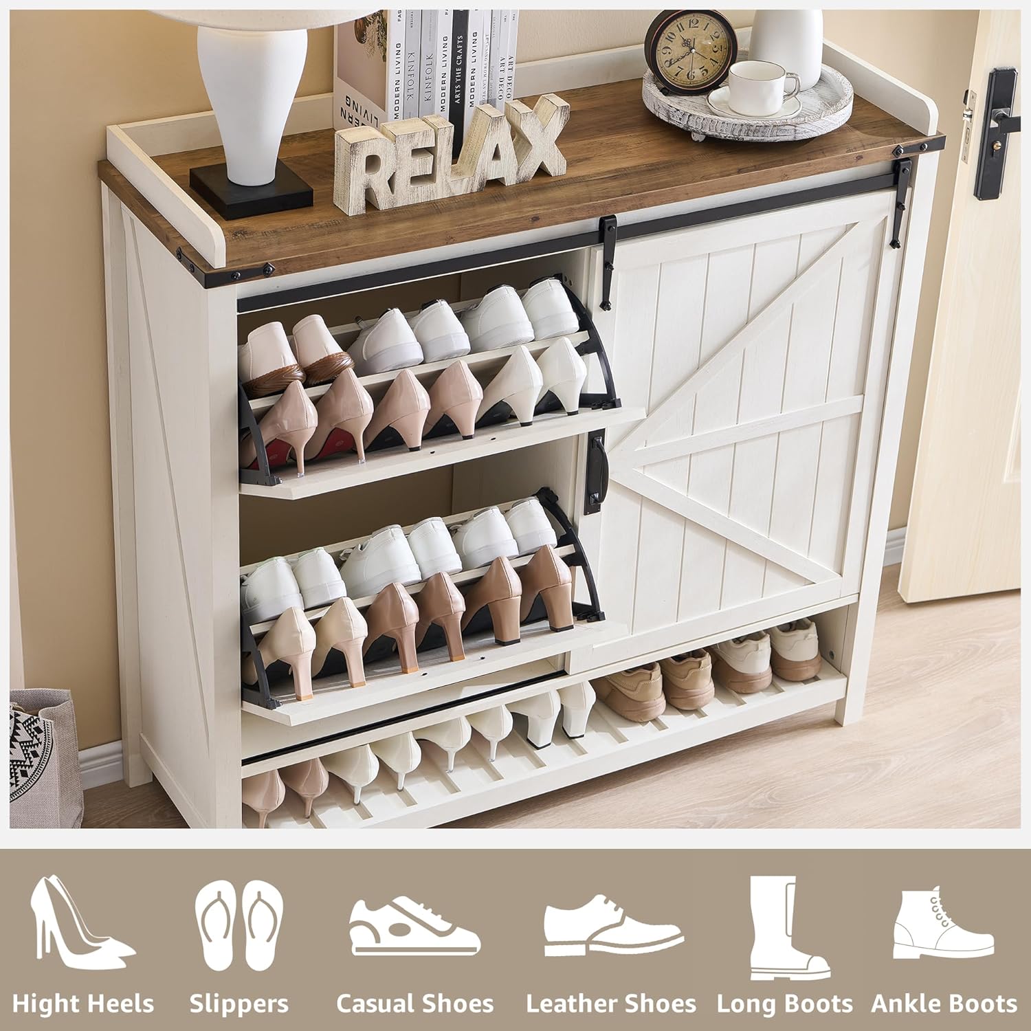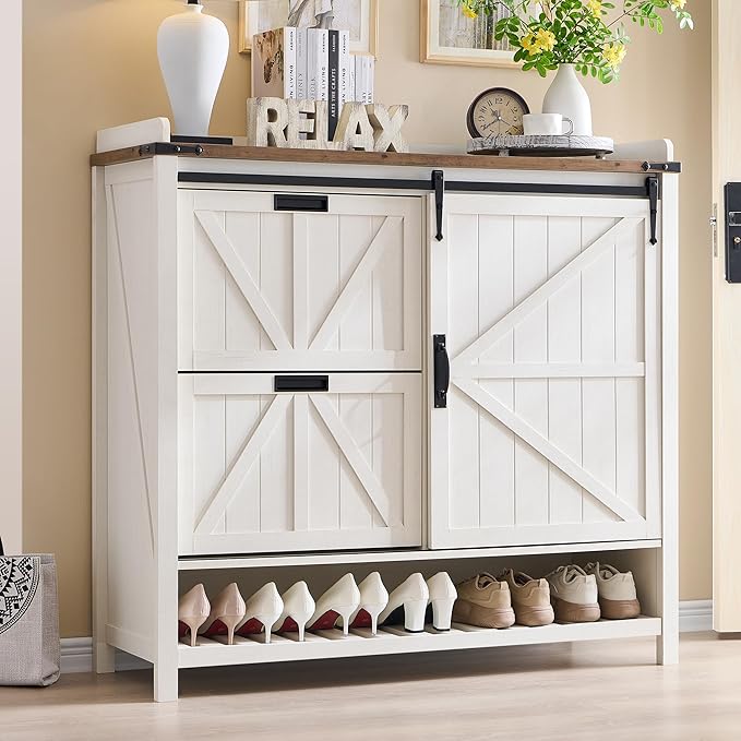 Farmhouse Shoe Storage Cabinet - 2 Flip Drawers and Sliding Door