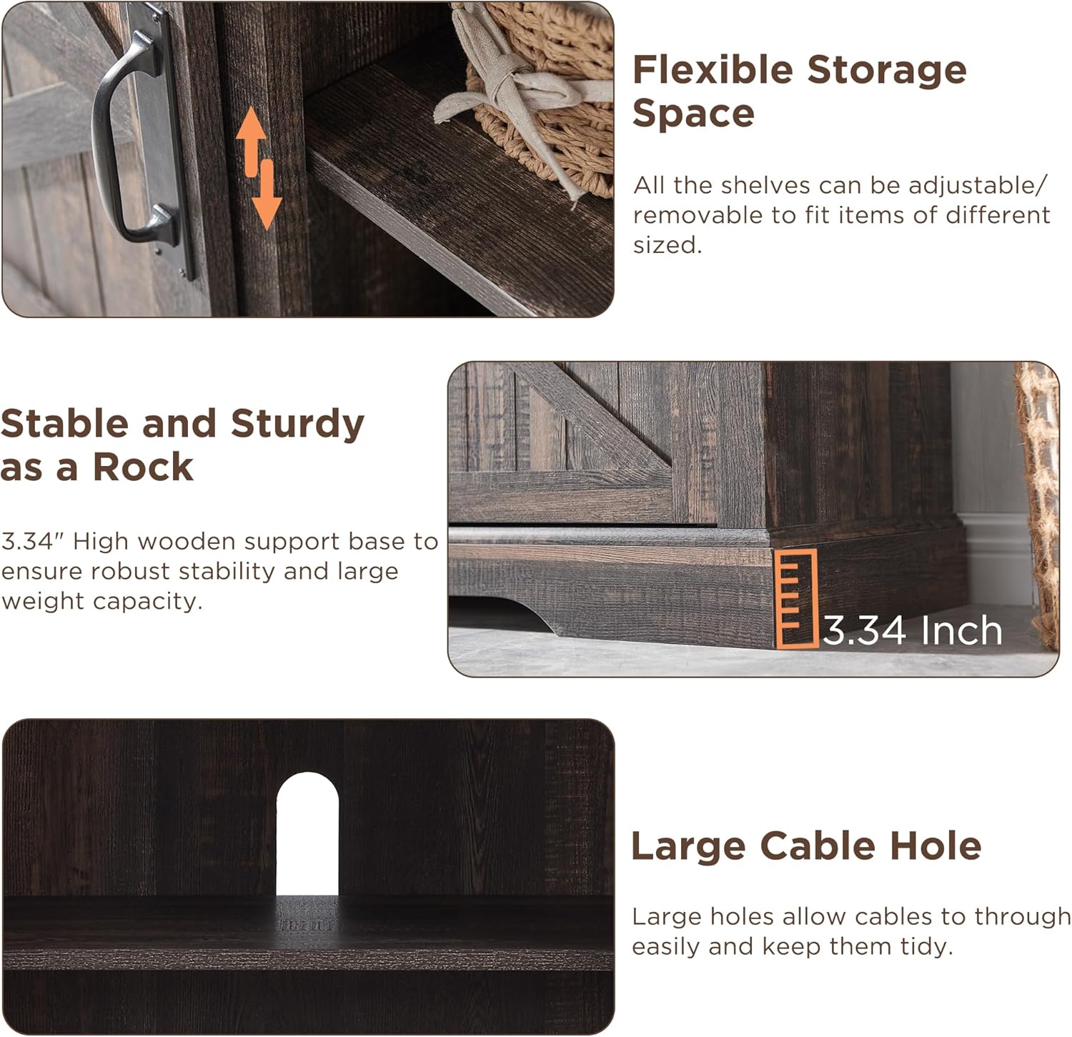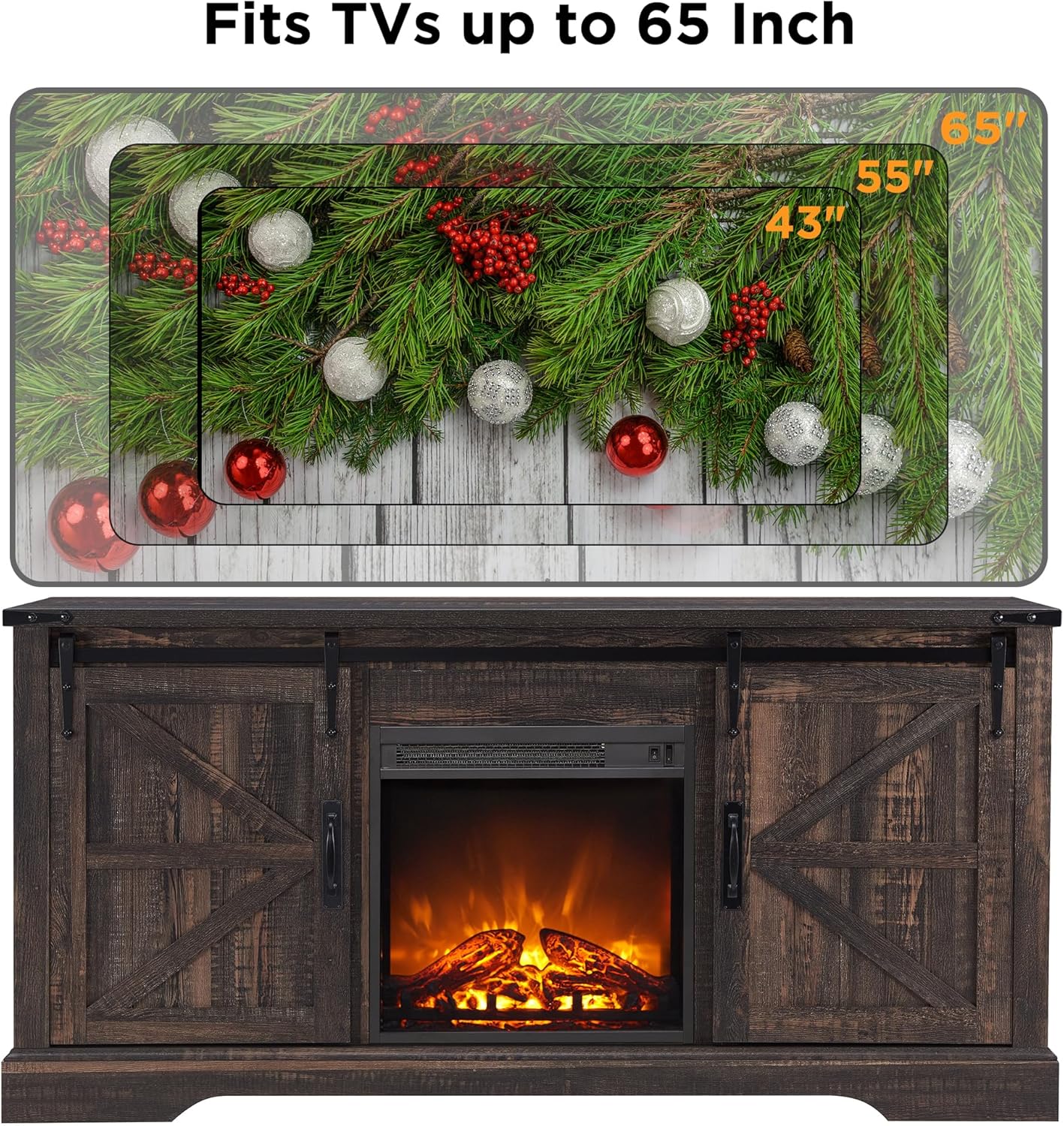 Rustic charm meets modern convenience with this farmhouse TV stand. The electric fireplace adds warmth and ambiance to your living room. Sliding barn doors reveal ample storage for media and accessories. This media console is designed to accommodate TVs up to 65 inches, creating a stylish and functional entertainment center.