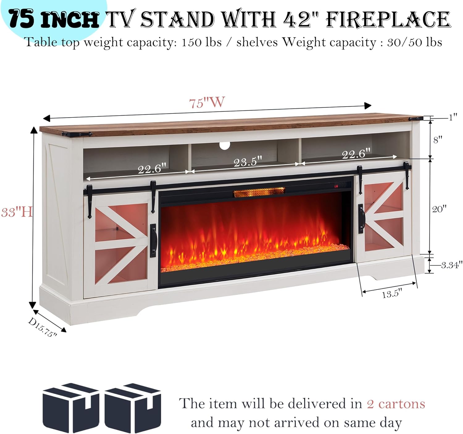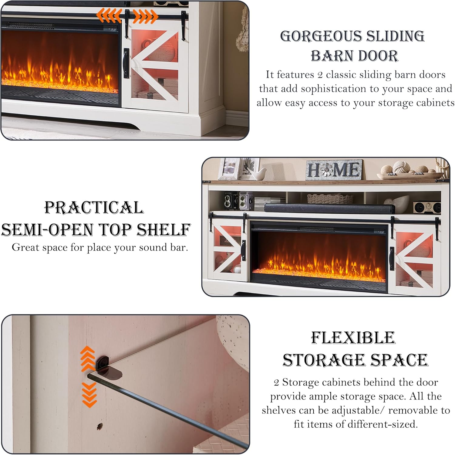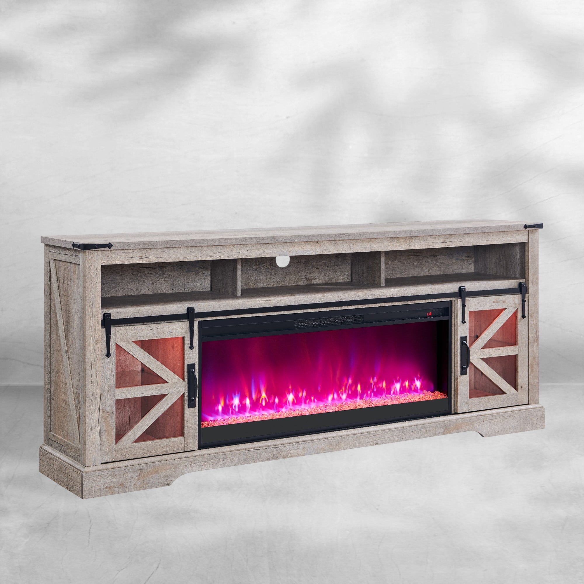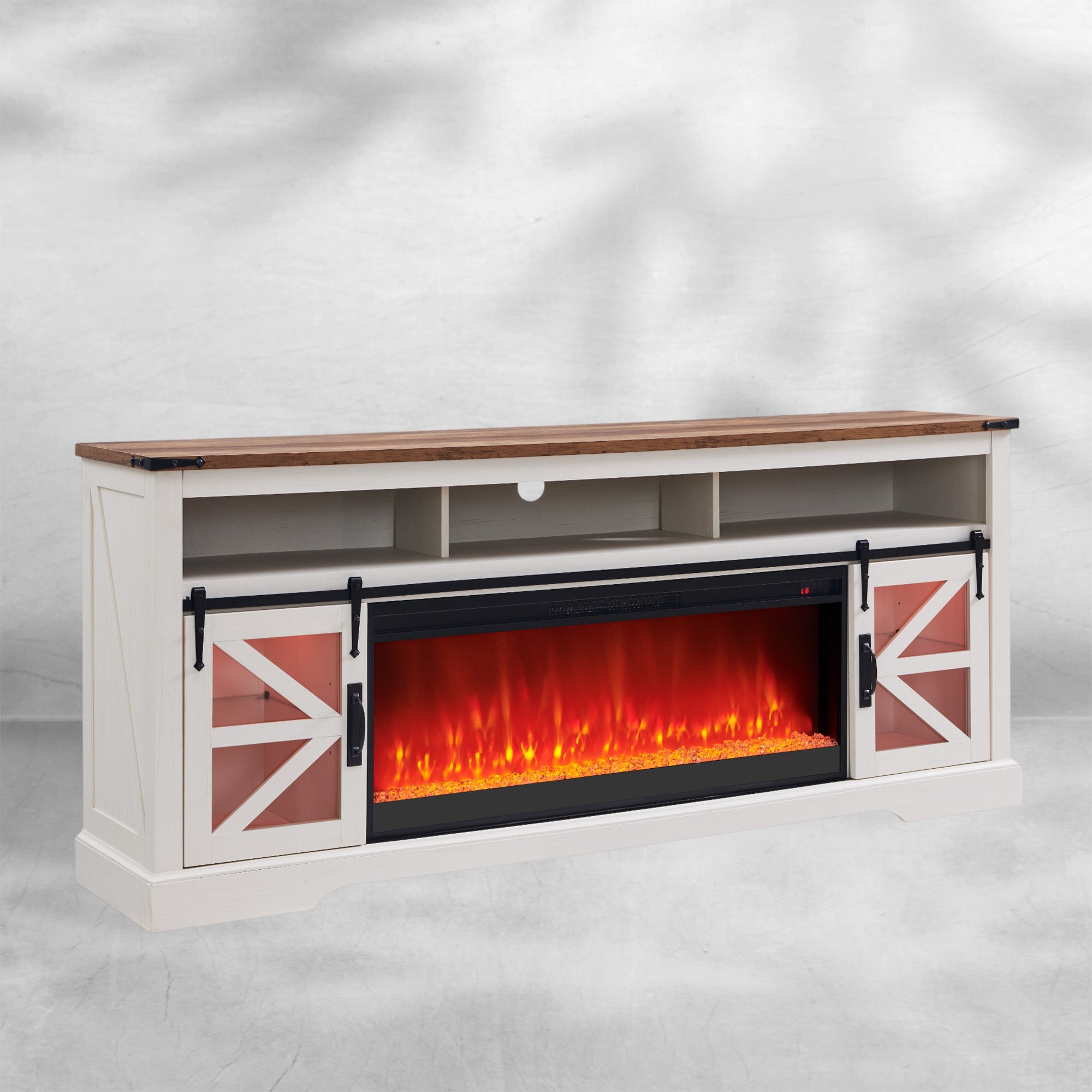 Features | Electric Fireplace, LED Lighting, Sliding Barn Door |