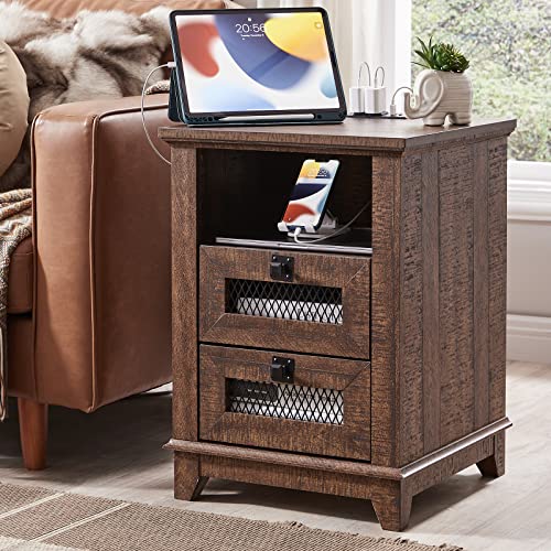 Industrial Nightstand with Charging Station, Rustic Farmhouse End Table