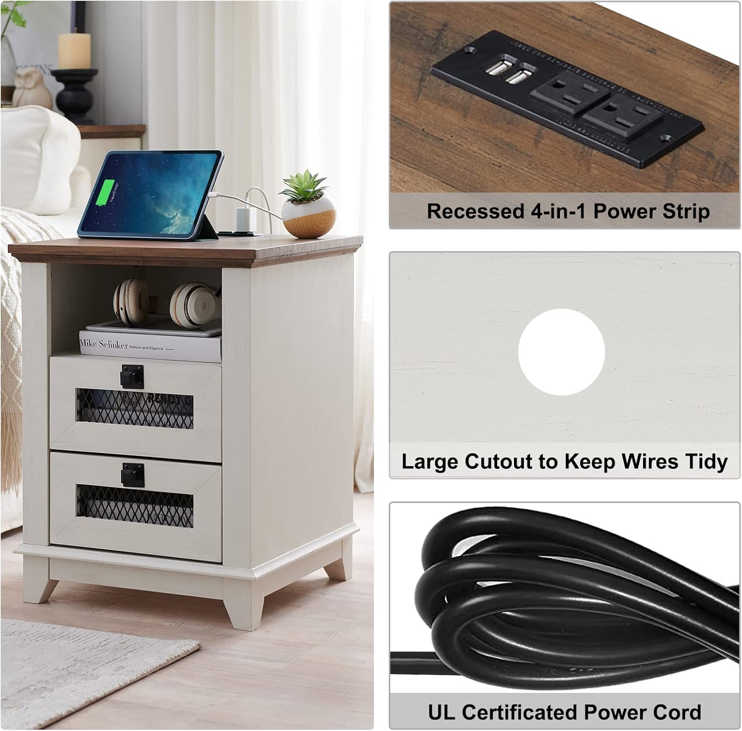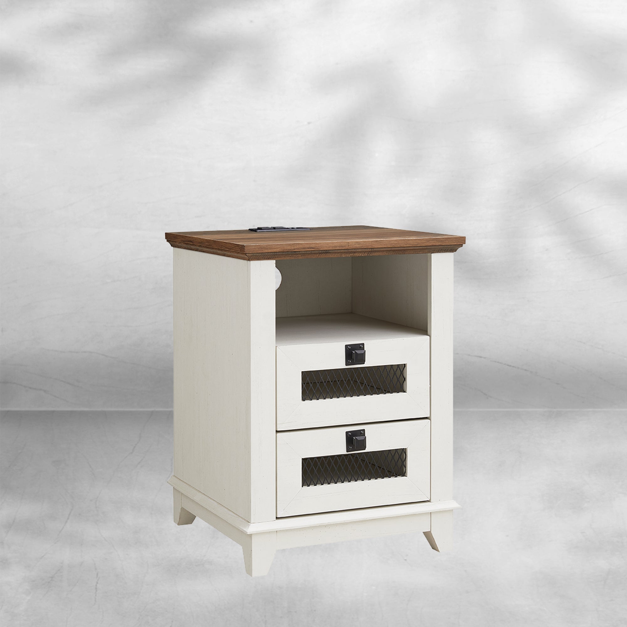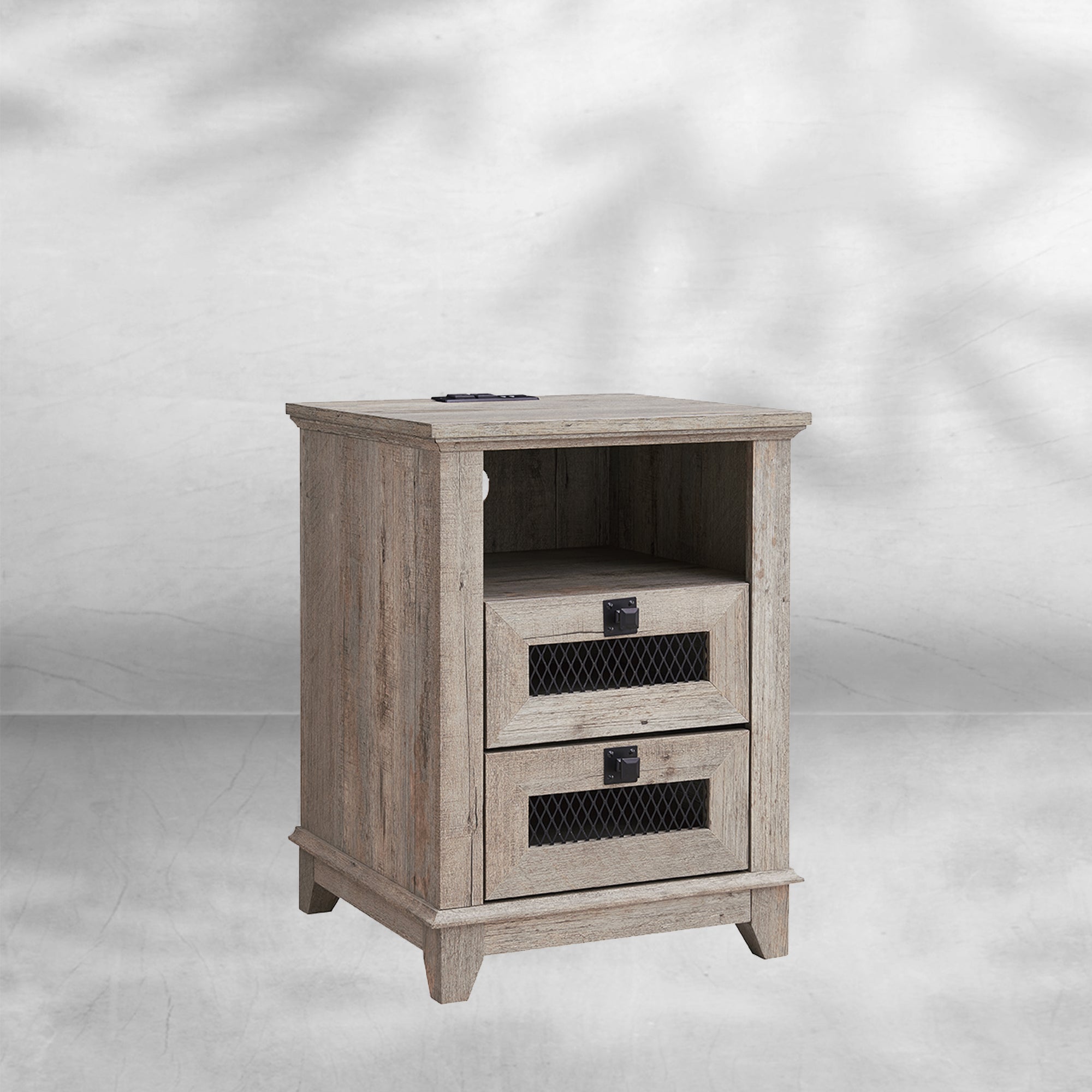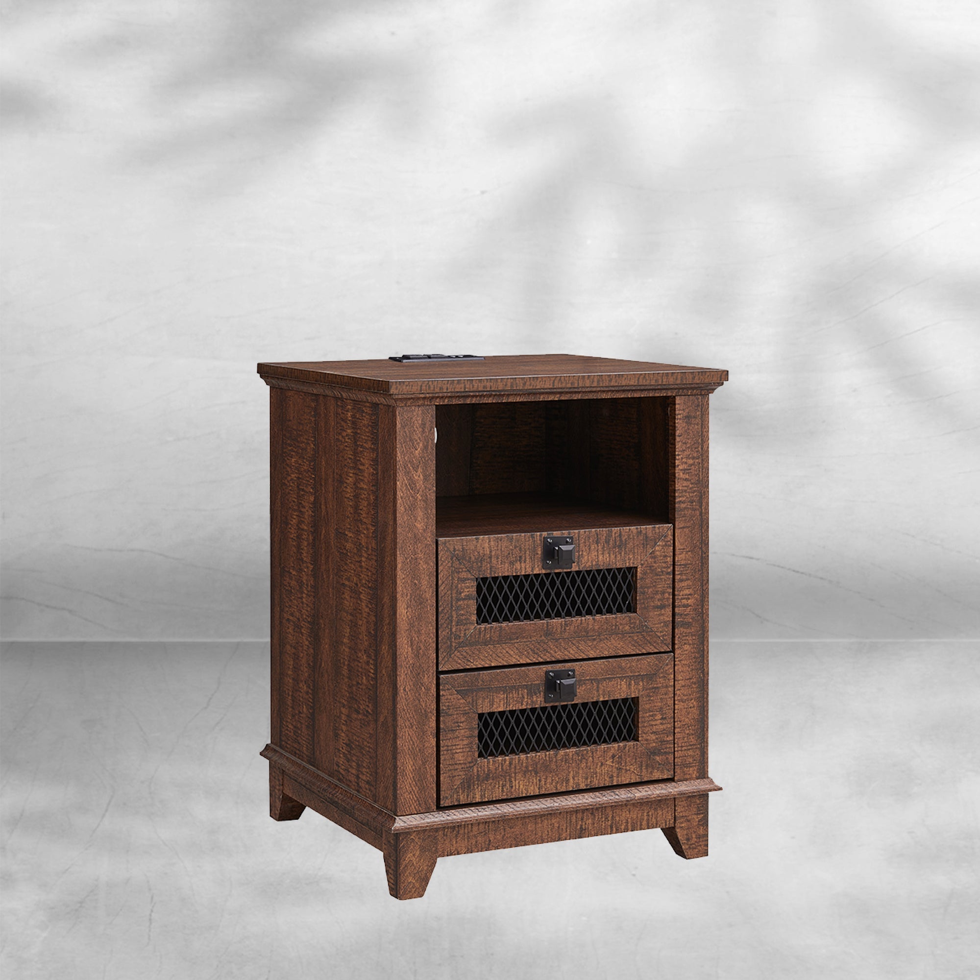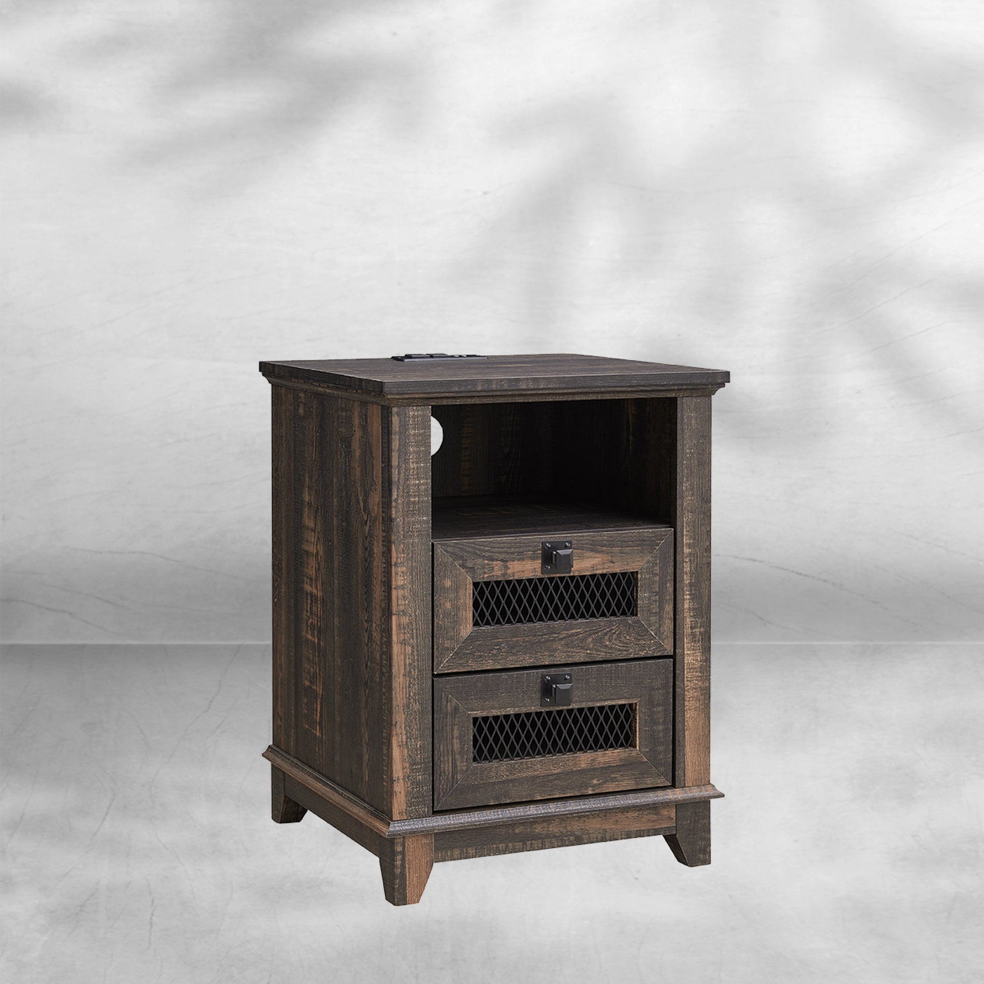 This industrial and farmhouse-style nightstand brings rustic charm to any space. Featuring a charging station, two drawers, and an open cubby, it offers both style and functionality. The rustic mesh drawers add a touch of character, making it a versatile piece for your bedroom, living room, or office. Keep your devices charged and your essentials organized with this elegant end table.