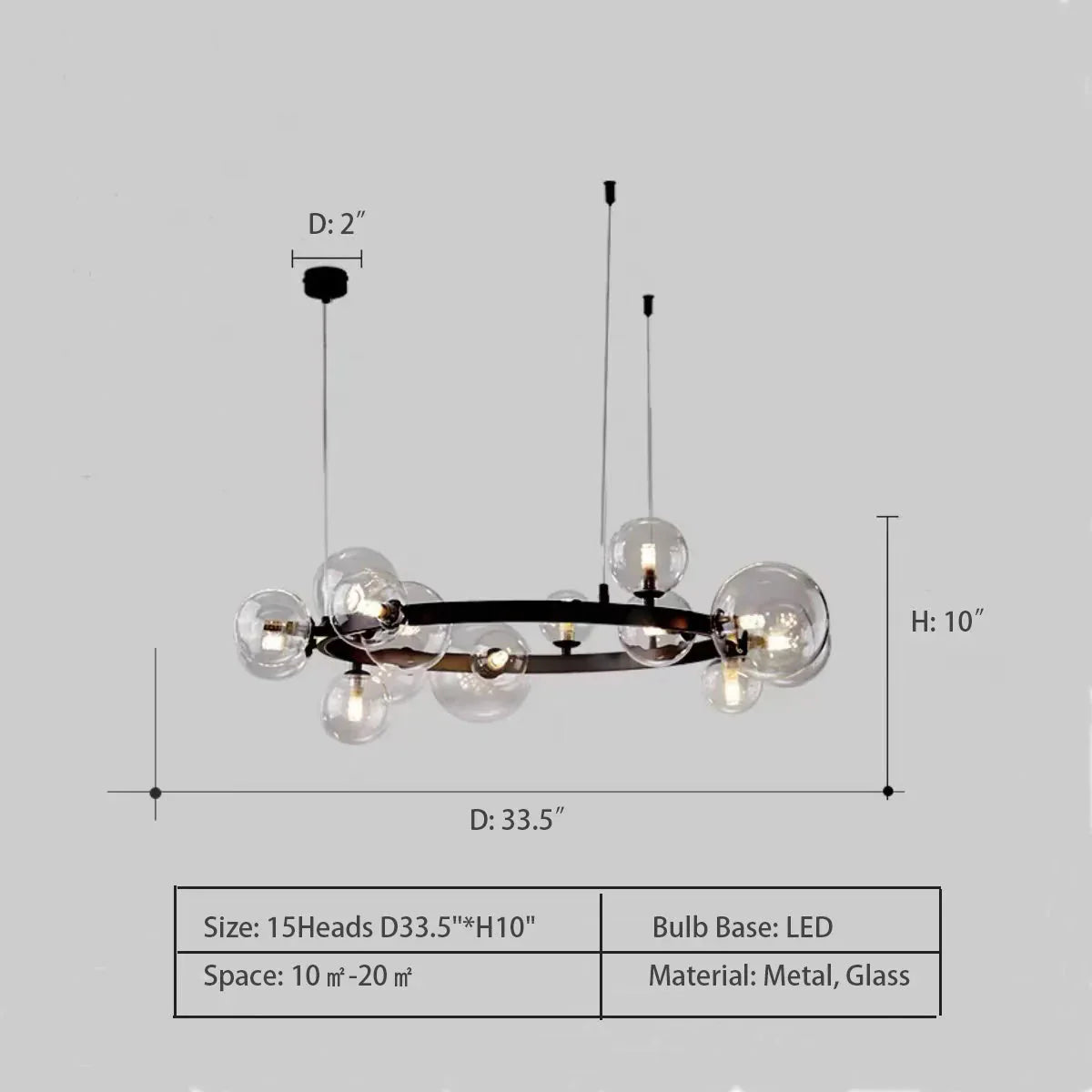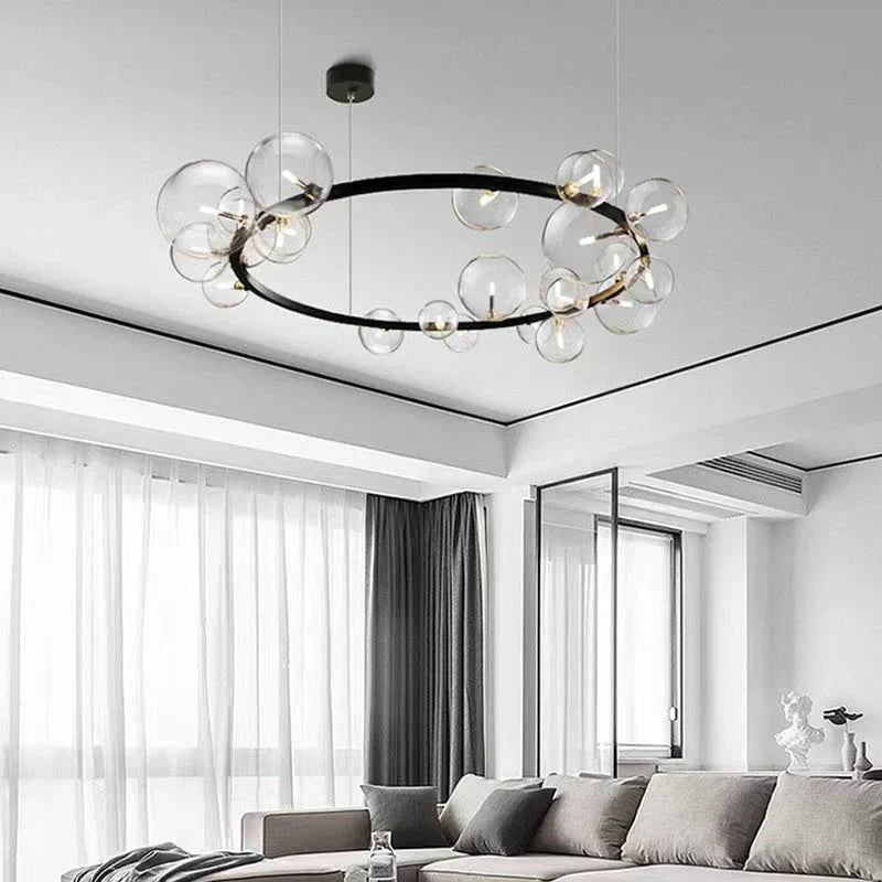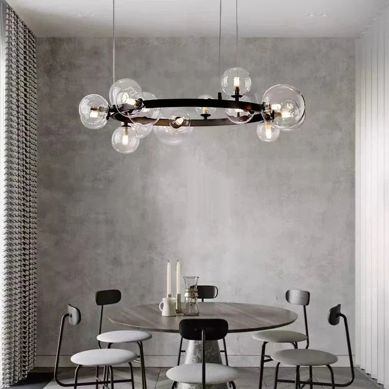 This chandelier set features a classic black iron wire and is decorated with a cluster of clear glass bubbles. The collection of clear glass bubble shades presents an appreciation of an elegant chic and sophisticated feel. Available in two versions: the ring style is more suitable for living and dining rooms; the linear style is ideal for kitchen islands, bars, etc.
