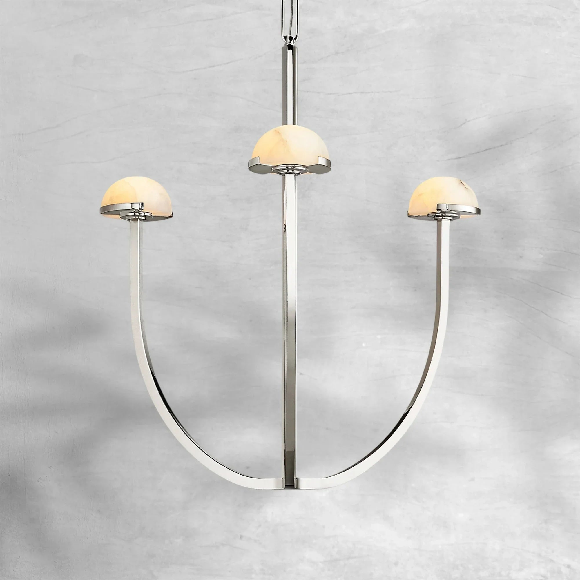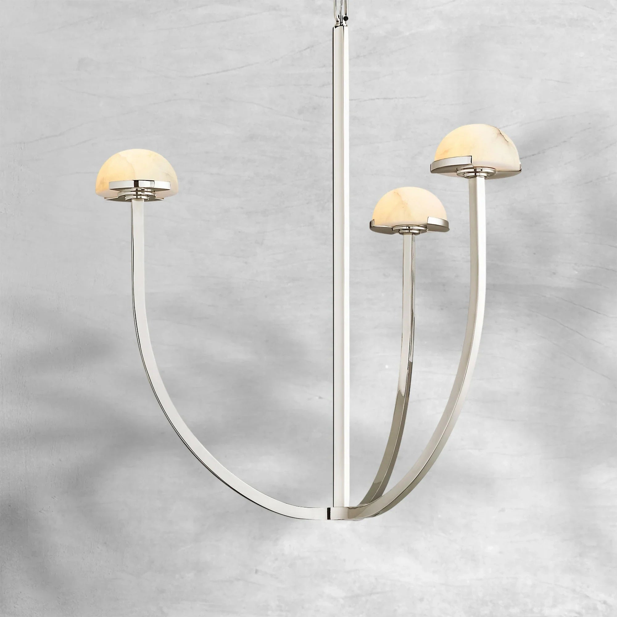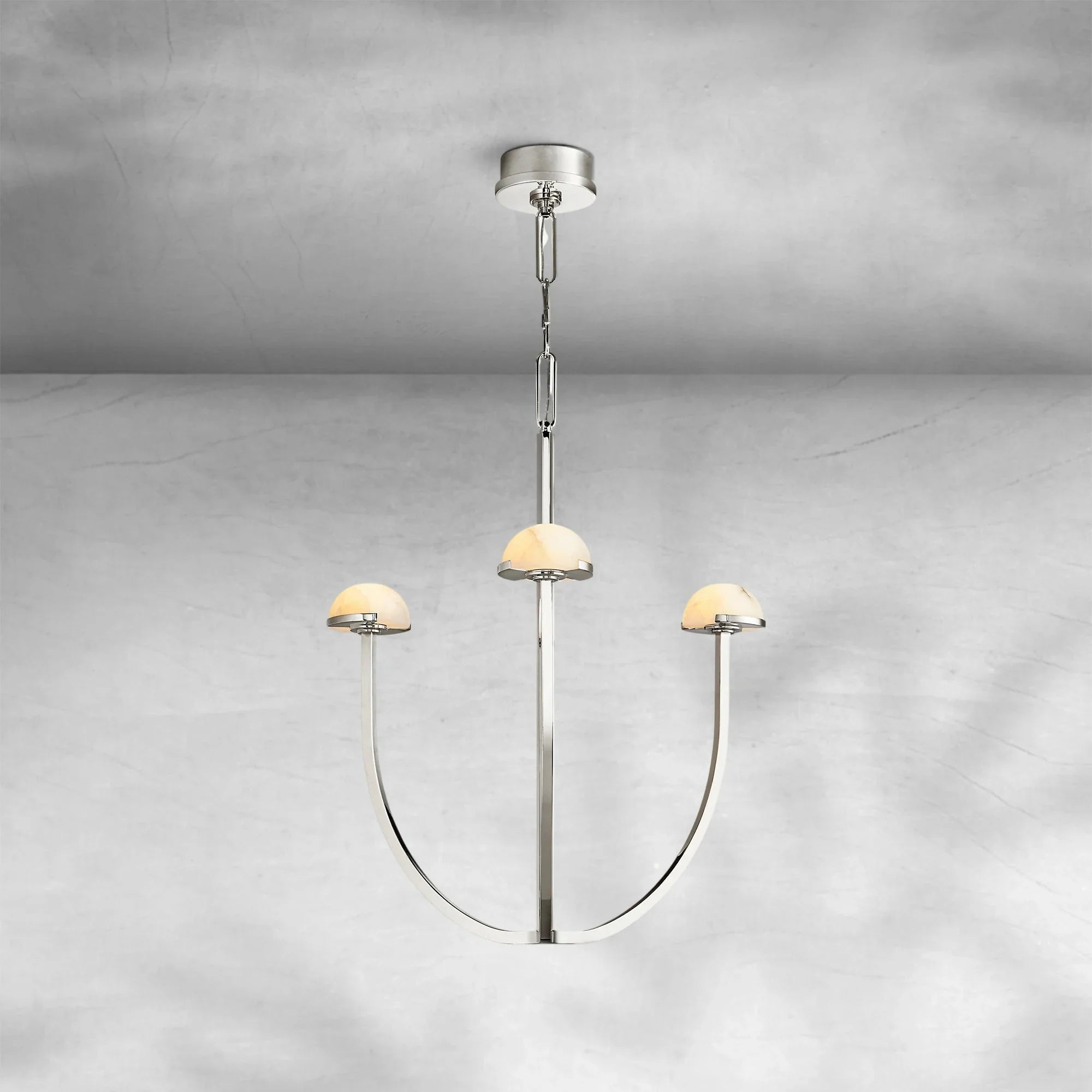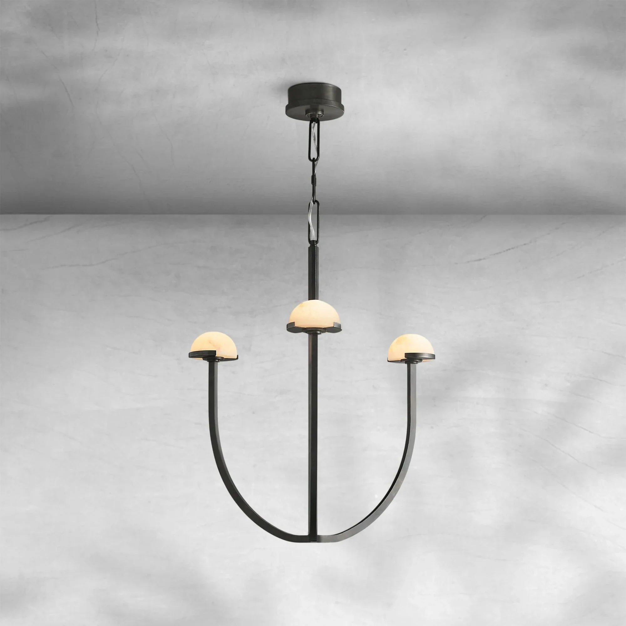 Minimalist in design yet maximalist in effect, our lighting collection was inspired by a midcentury Italian silhouette. Metal armatures reminiscent of architectural tracery support a constellation of dome-shaped, translucent alabaster shades that highlight the stone's natural veining and coloration. The sculptural form emits a warm, filtered glow.