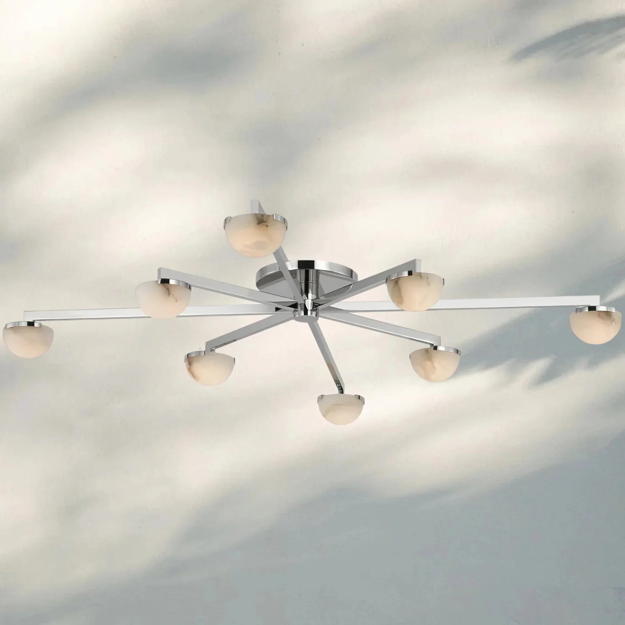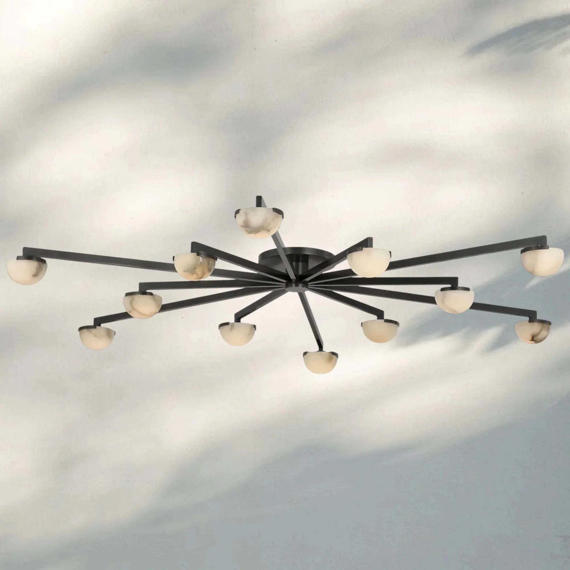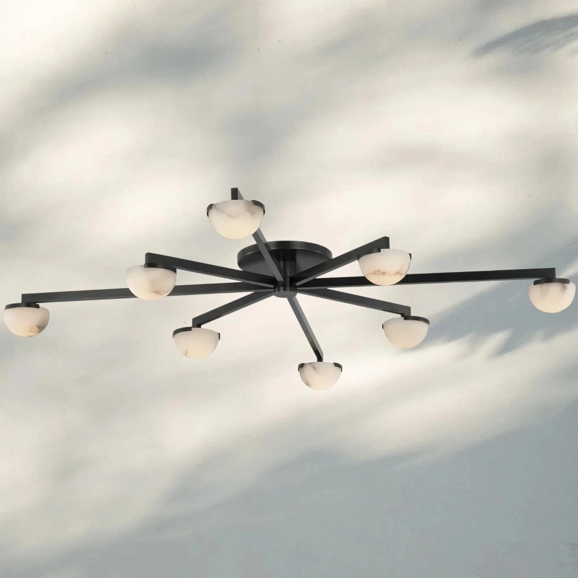 Minimalist midcentury Italian lighting with metal frames and alabaster shades, offering warm ambient glow and timeless elegance.