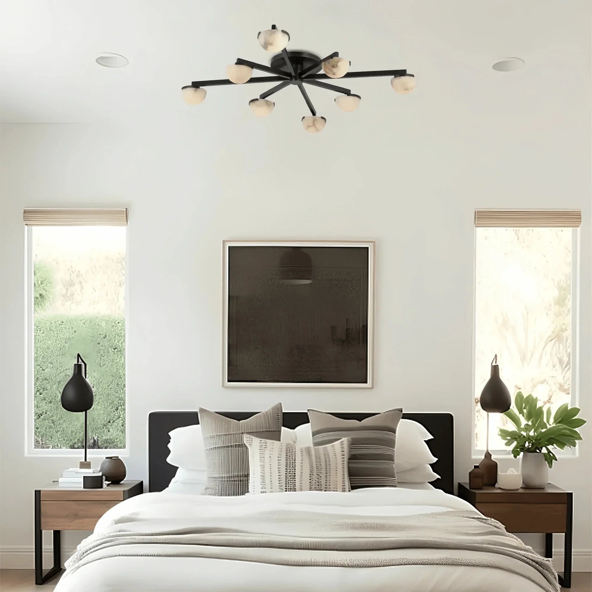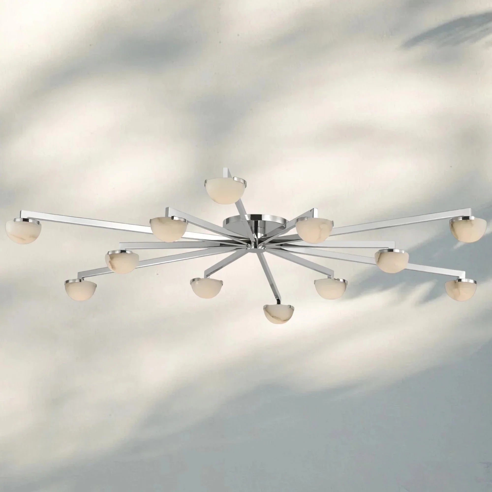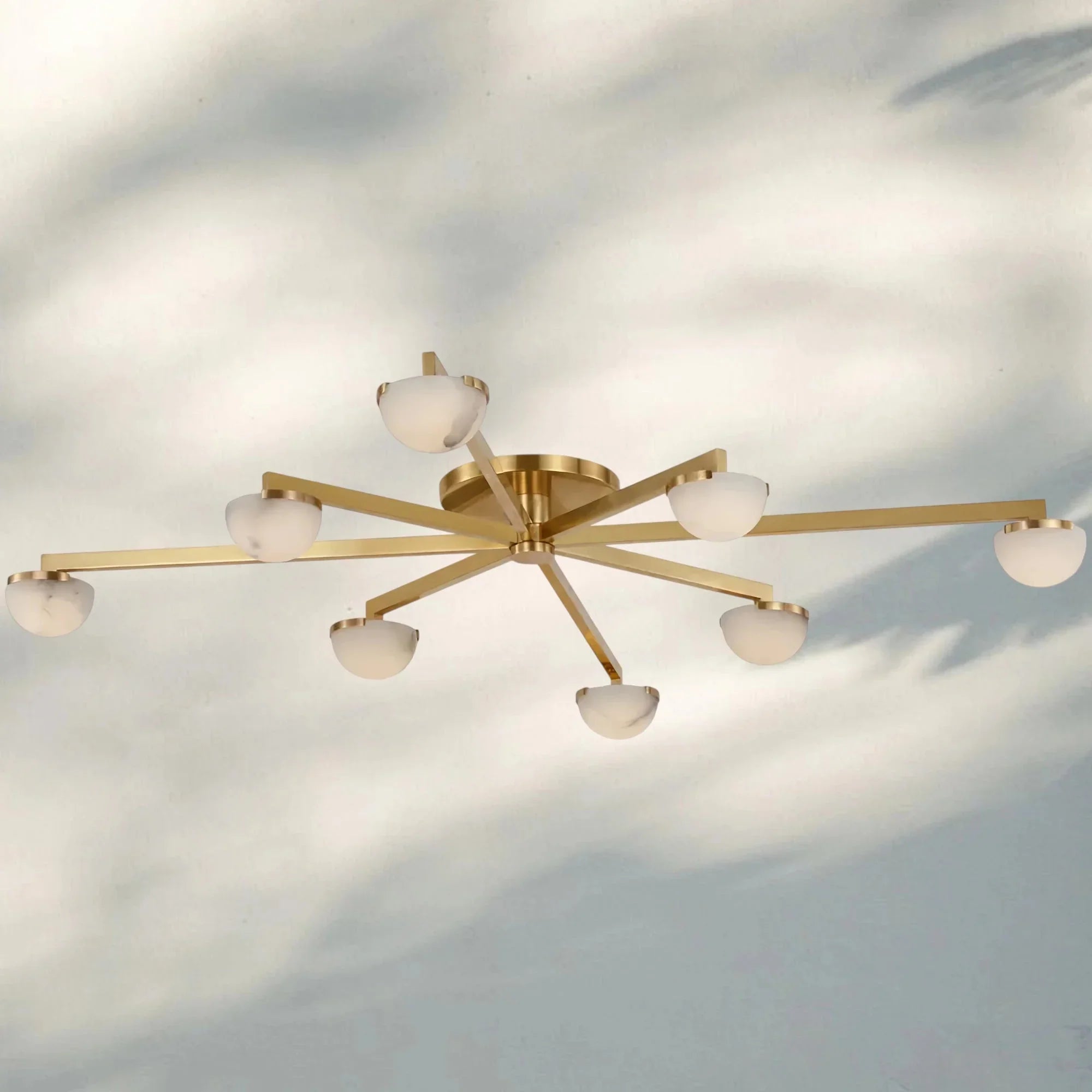 Minimalist midcentury Italian lighting with metal frames and alabaster shades, offering warm ambient glow and timeless elegance.