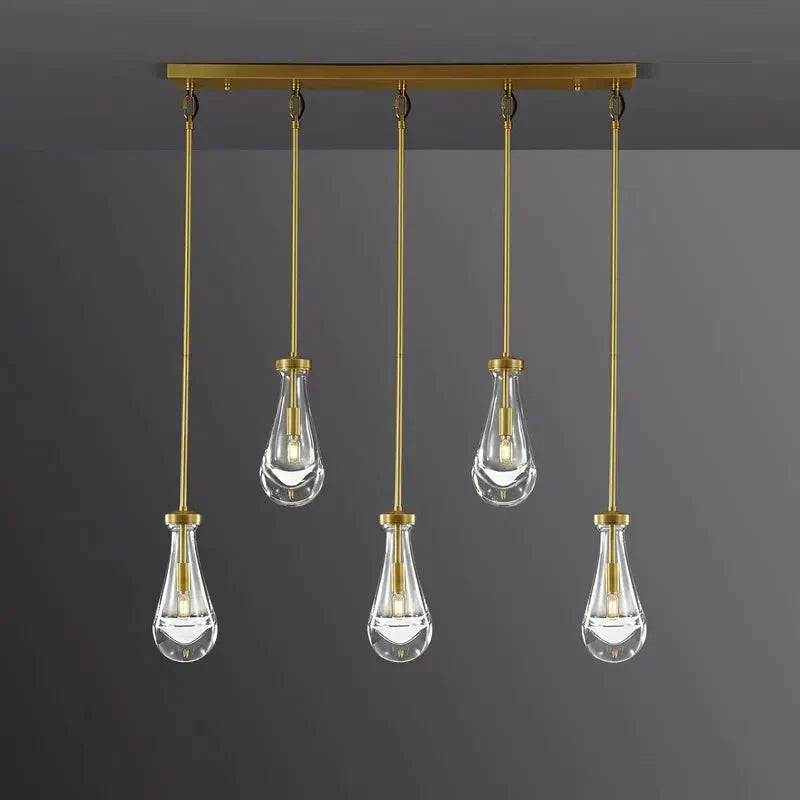 Much like the rhythm of a rainstorm itself. Suspended from slim black cords, drops of blown glass encase the bulbs – creating the illusion of underwater illumination – and cast luminous ripples that wash across ceilings and walls. |