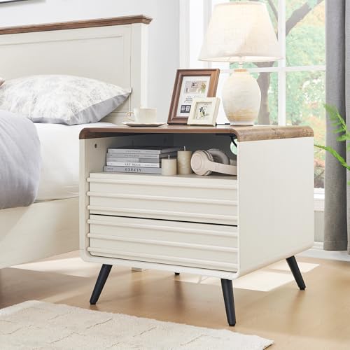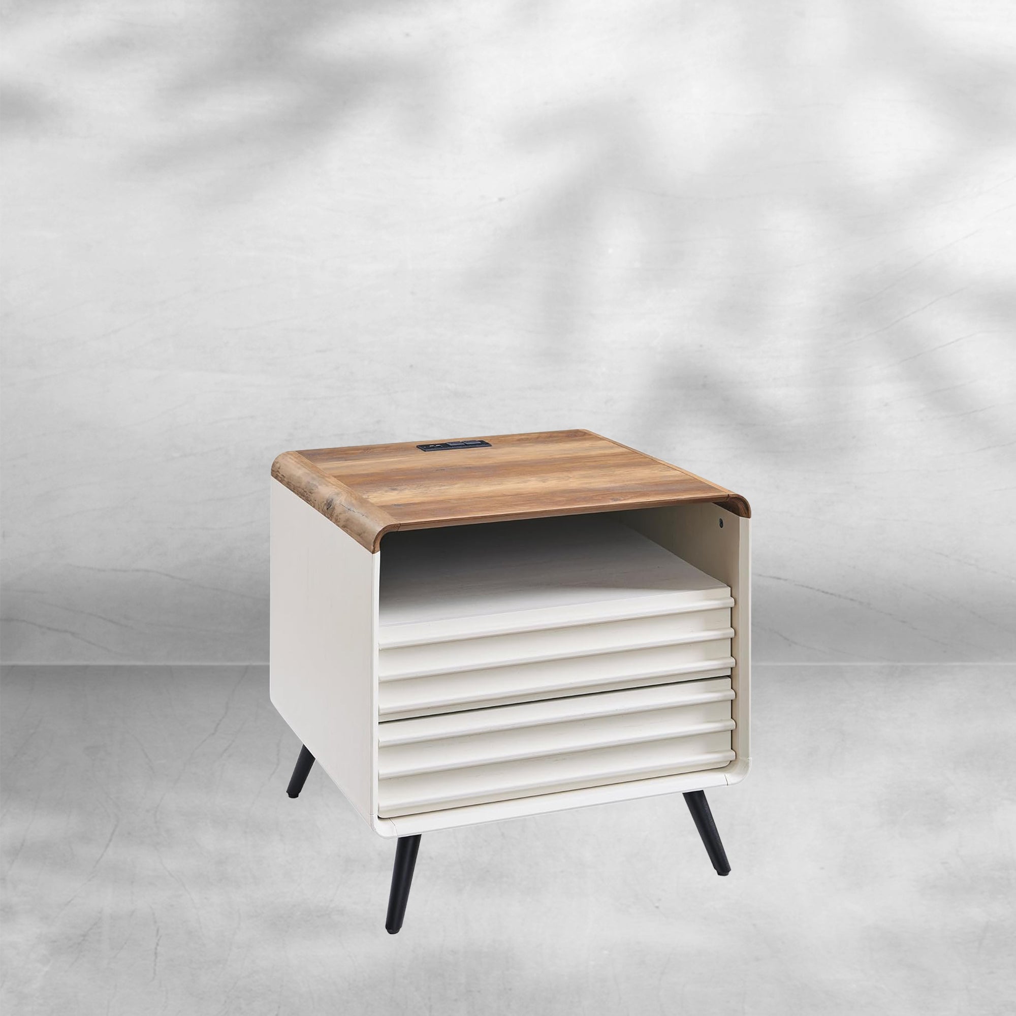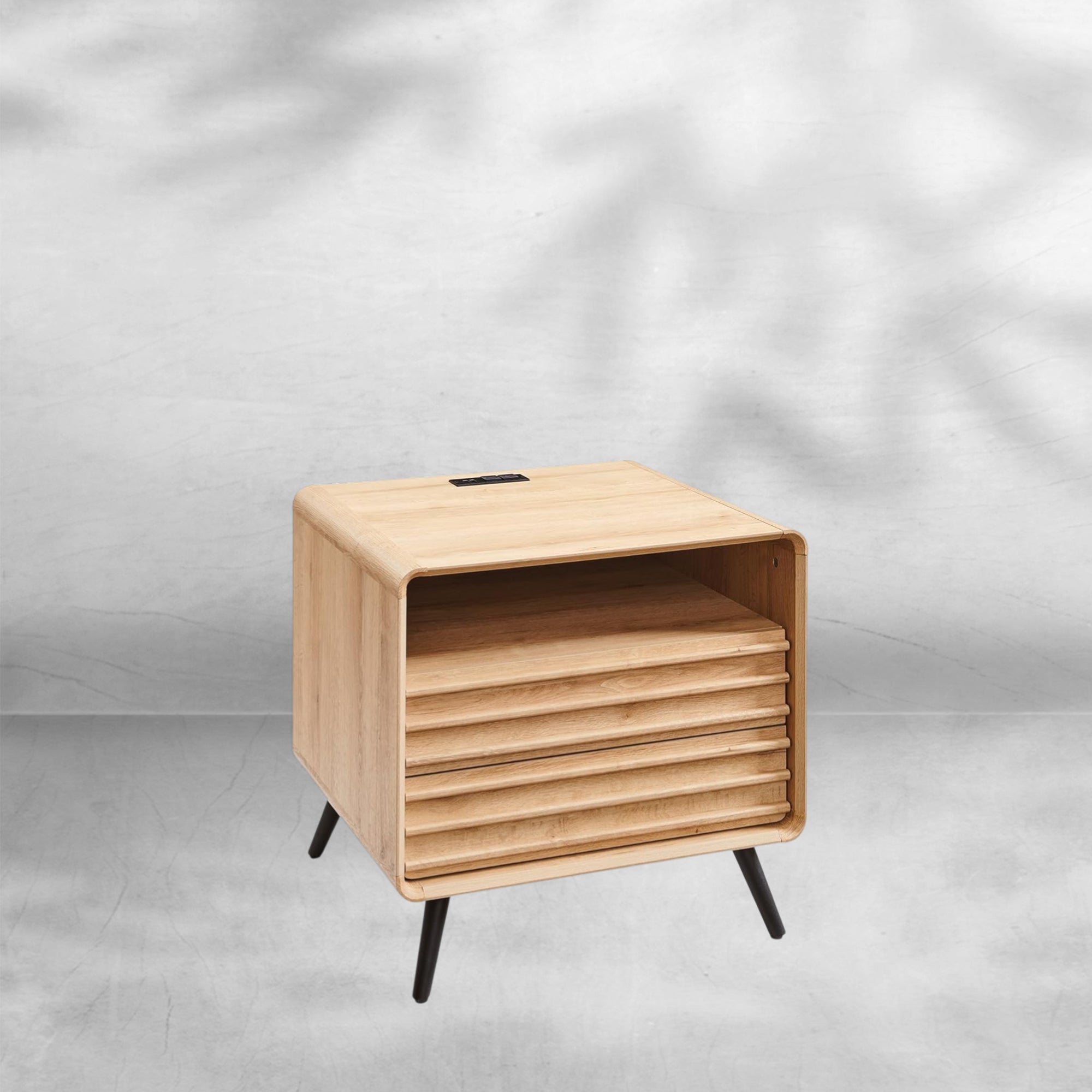 Elegantly designed to complement any bedroom, living room, or office. This nightstand boasts a fluted design which adds a touch of sophistication, while the built-in charging station keeps your devices powered up. Two drawers and an open cubby provide ample storage for your essentials. Natural oak finish enhances the warmth and style of your space.