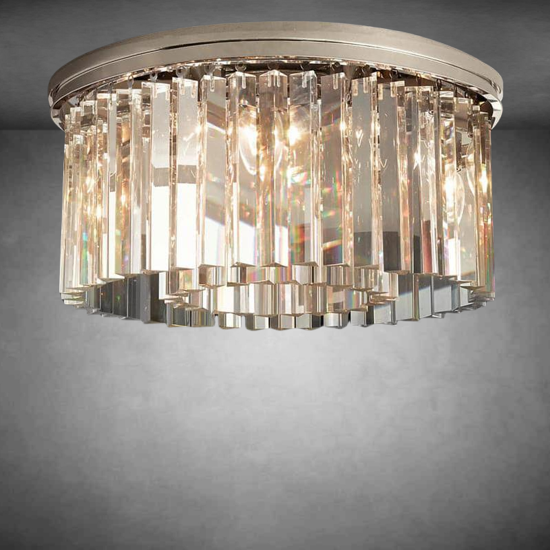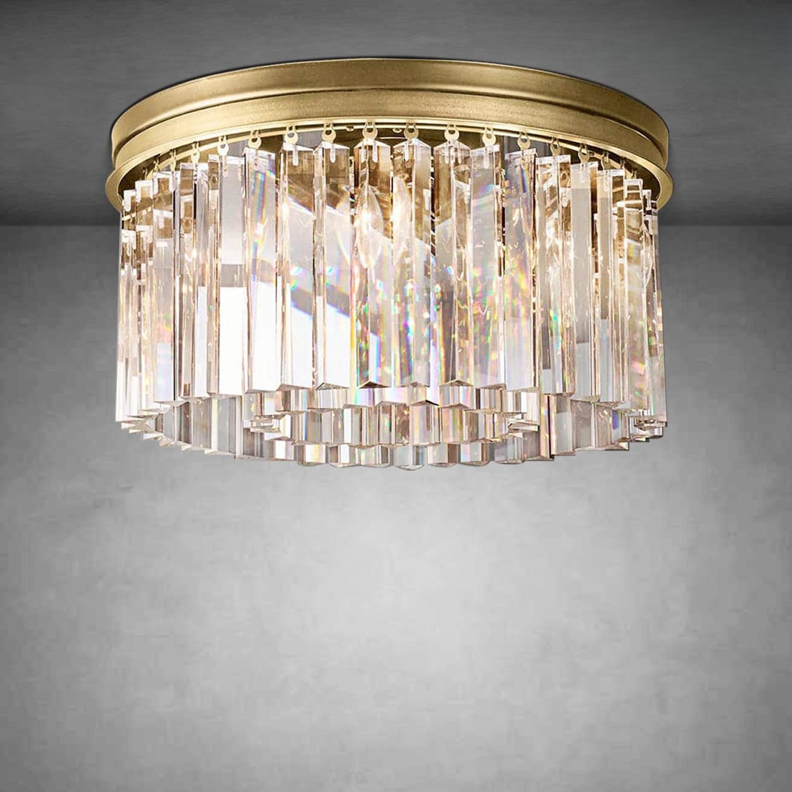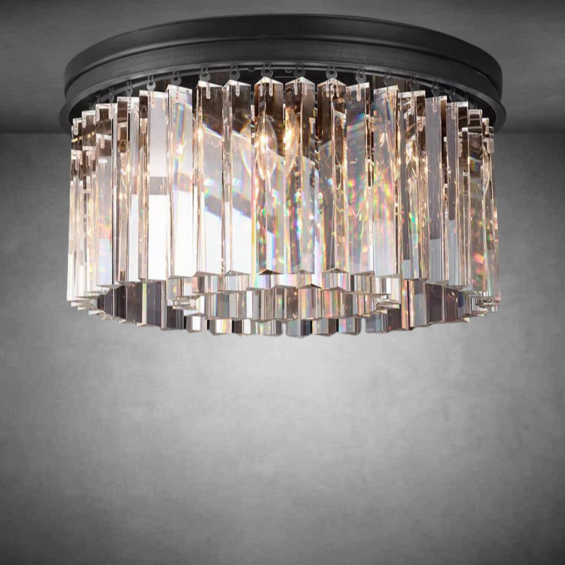 The Art Deco style of the Rhys collection is reflected in the straight and curved lines of our elegant fixtures. Its optical-grade prisms are arranged in evenly spaced concentric rings, suspended from an iron frame that shines in harmony.