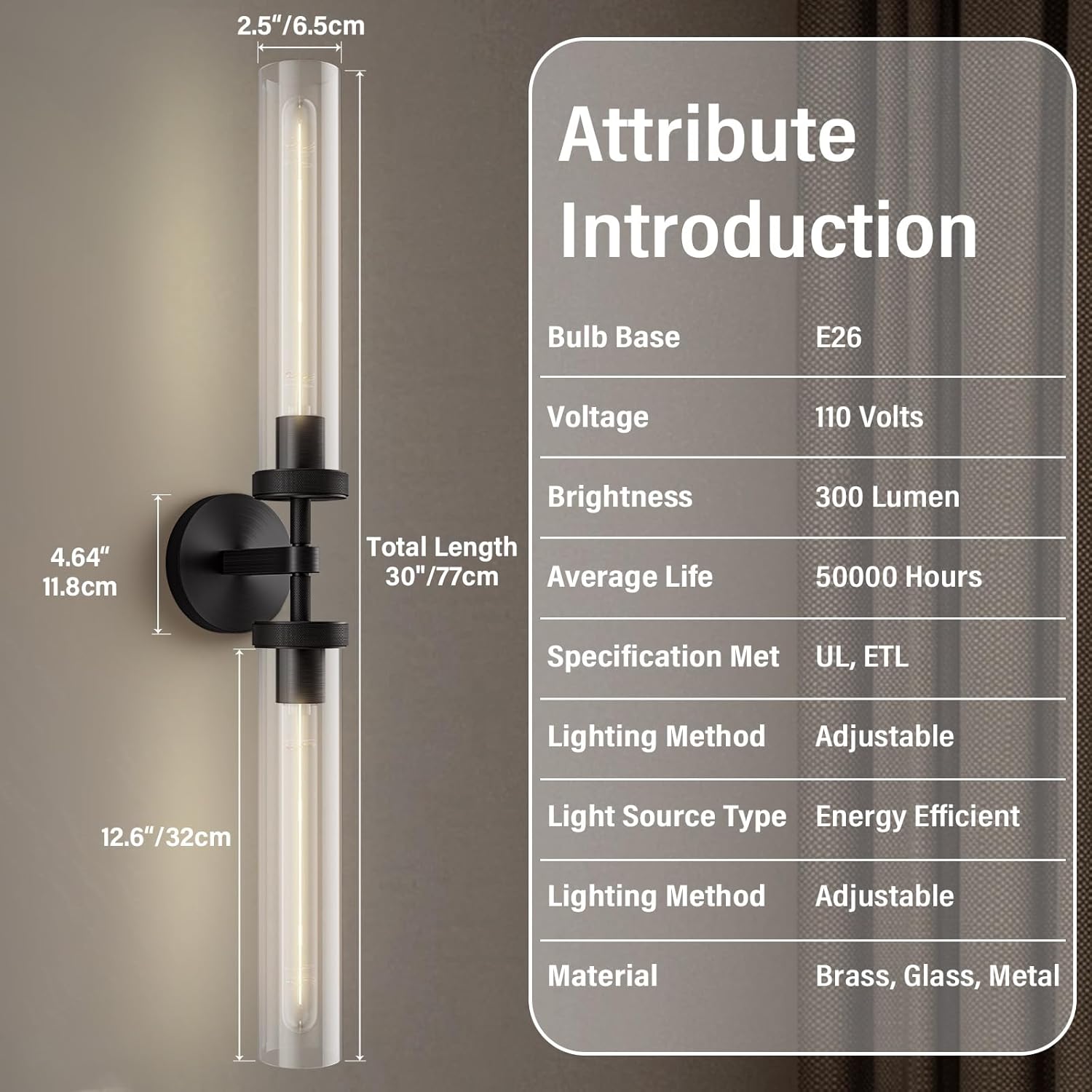 This sleek double‑sconce dazzles with a crystal‑clear glass tube and a brushed‑copper base that spreads warm white glow. At 30 inches tall and just 2.5 inches deep, it fits snugly above mirrors, hallways or bedside tables. The knurled black shade adds a modern edge while the included LED bulb and dimmer switch let you set the perfect mood. Weighing 11.2 lb, it’s sturdy enough for any indoor space and comes ready to mount in minutes.
