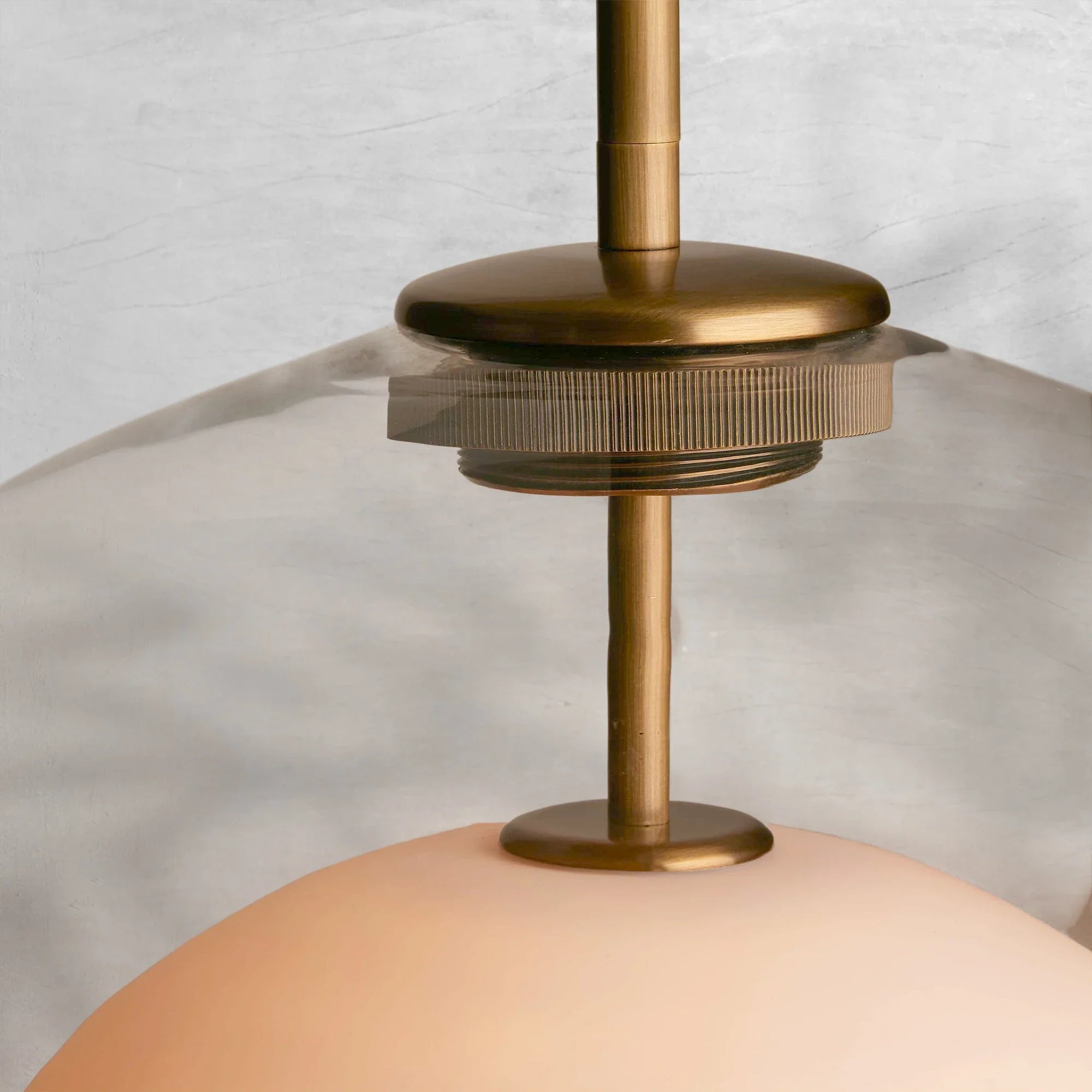 - Crafted from glass and steel with a warm brass finish.