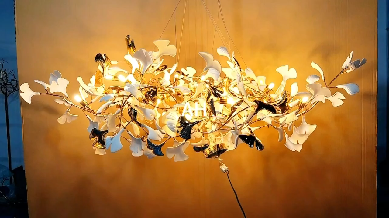 This ceramic ginkgo tree petal chandelier shows its luxurious style in overall design. material. and manufacturing technology. It will stand out among many lighting styles. The brass lamp body is covered with exquisite ceramic petals. which reflects the perfect combination of lighting design and natural plants. The surrounding ceramic petals unfold outward. lifelike. Fine workmanship. Each chandelier is a unique art.