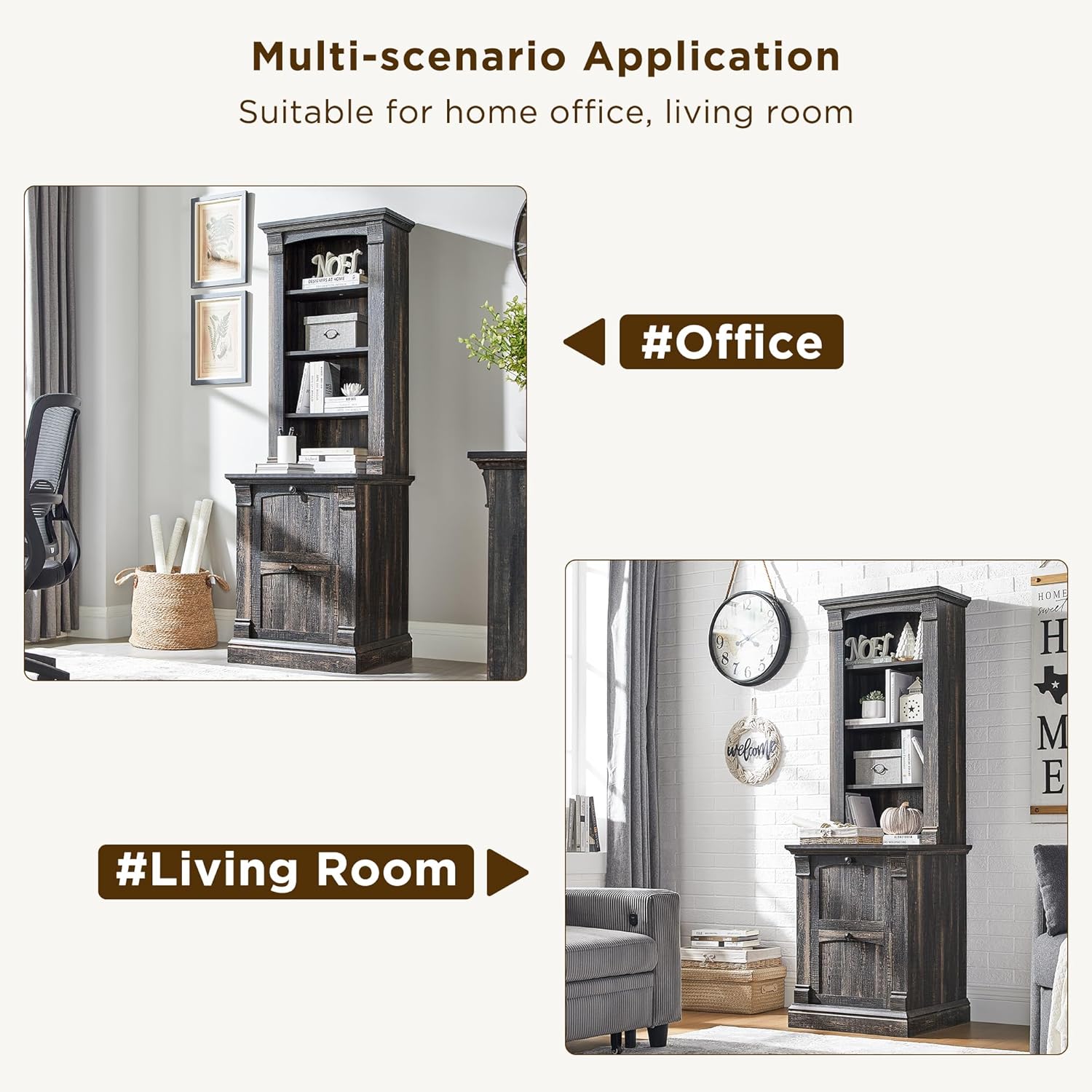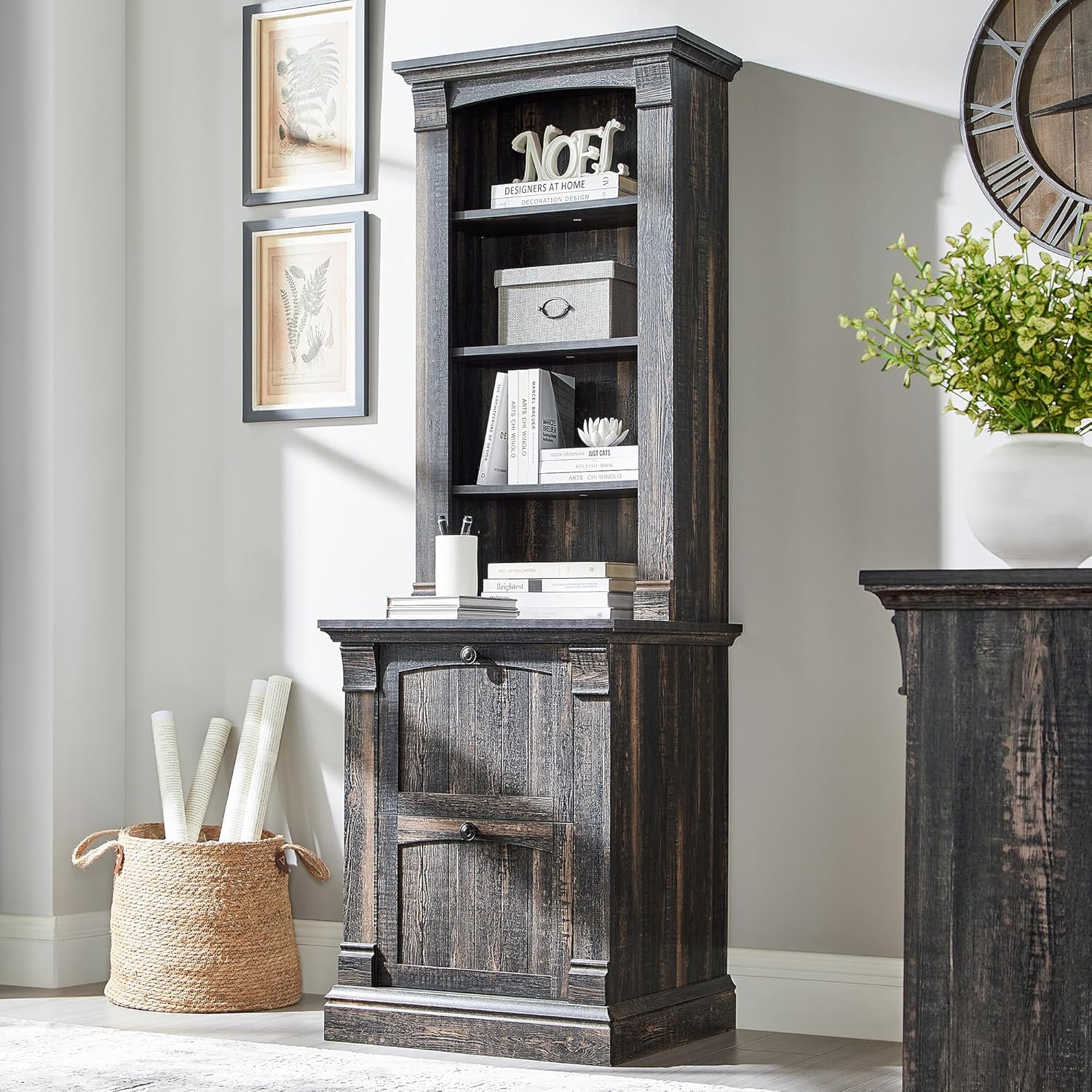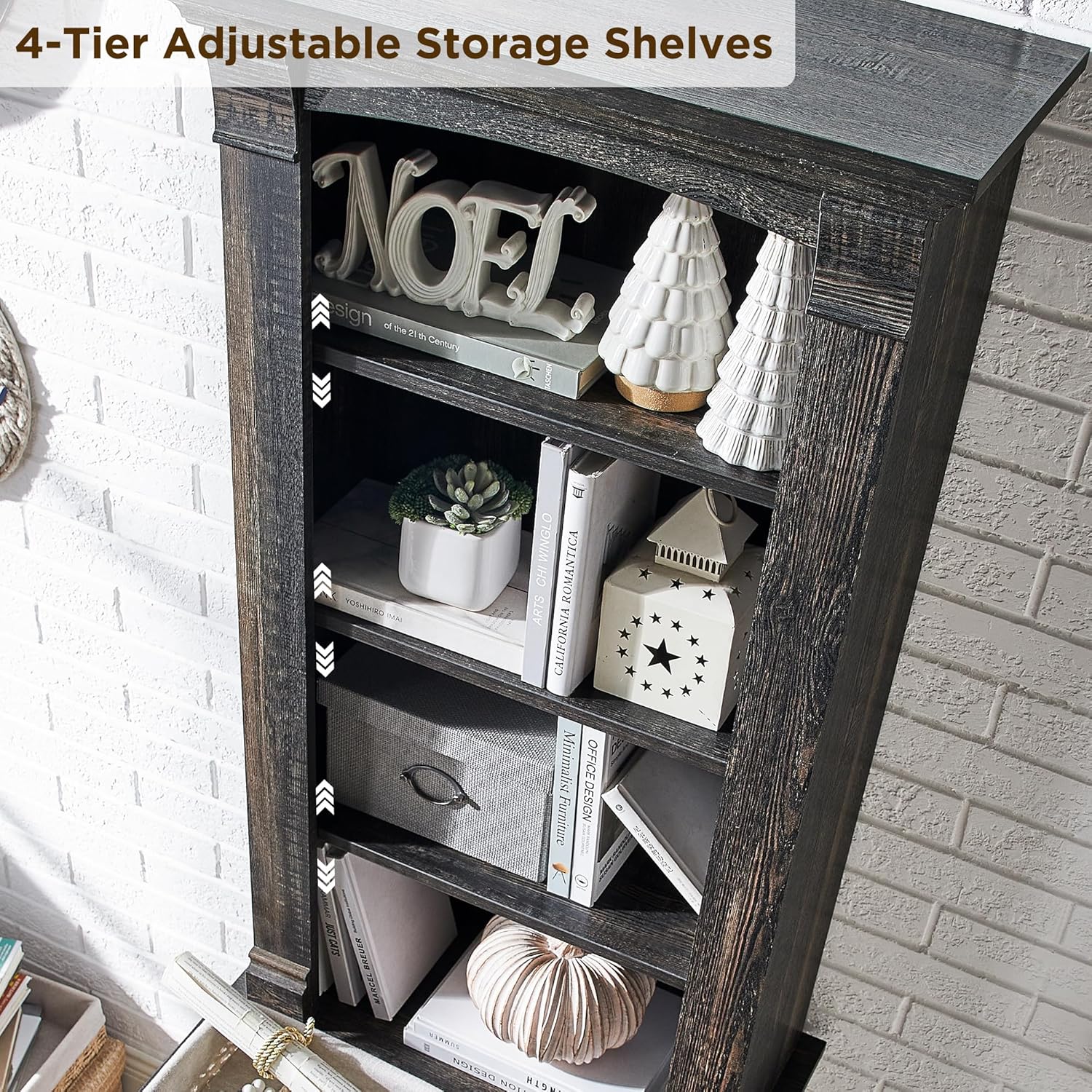 Organize your home or office with this stylish farmhouse bookcase. It features four adjustable open shelves for displaying books, d¨¦cor, or storing essentials. The two convenient drawers offer concealed storage to keep your space clutter-free. Crafted with a dark rustic oak finish, this bookcase adds a touch of warmth and sophistication to any room.