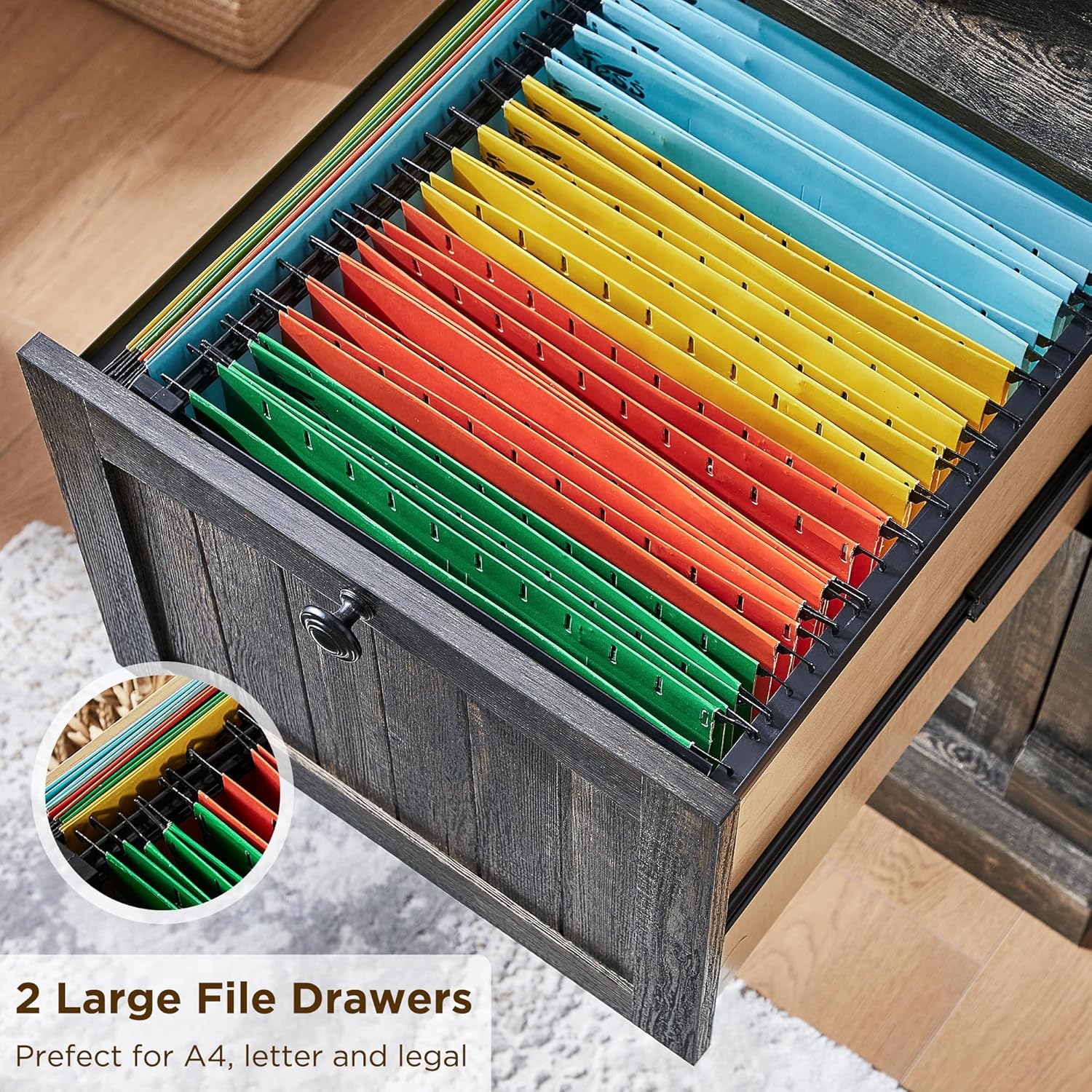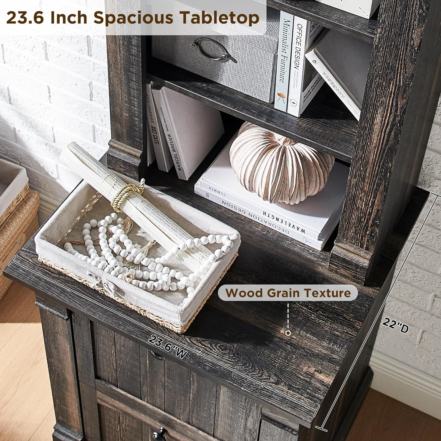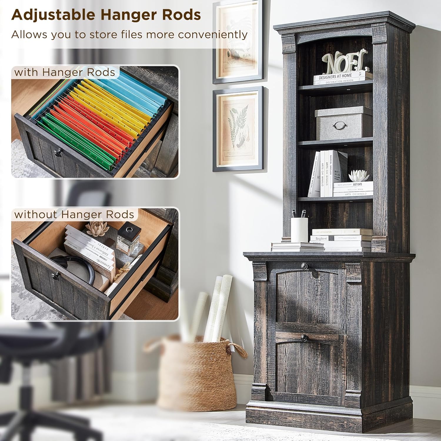 Organize your home or office with this stylish farmhouse bookcase. It features four adjustable open shelves for displaying books, d¨¦cor, or storing essentials. The two convenient drawers offer concealed storage to keep your space clutter-free. Crafted with a dark rustic oak finish, this bookcase adds a touch of warmth and sophistication to any room.