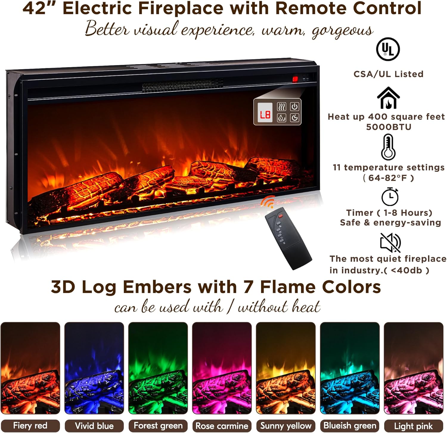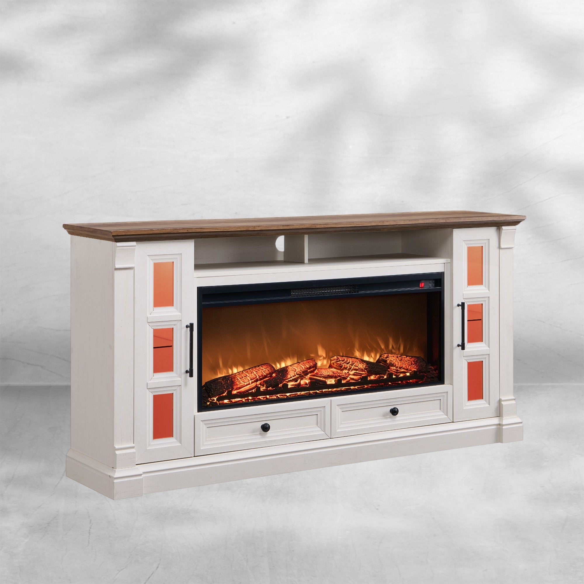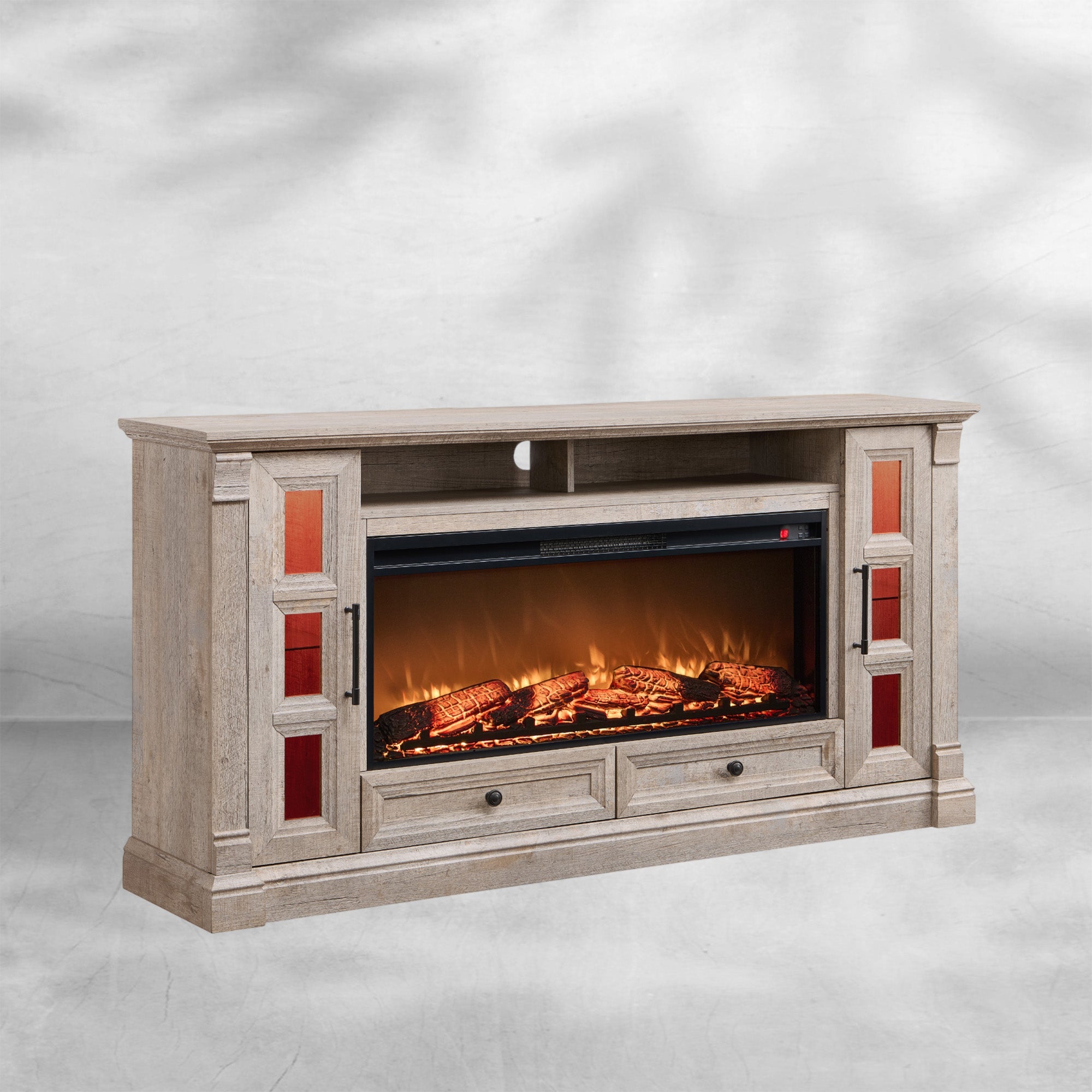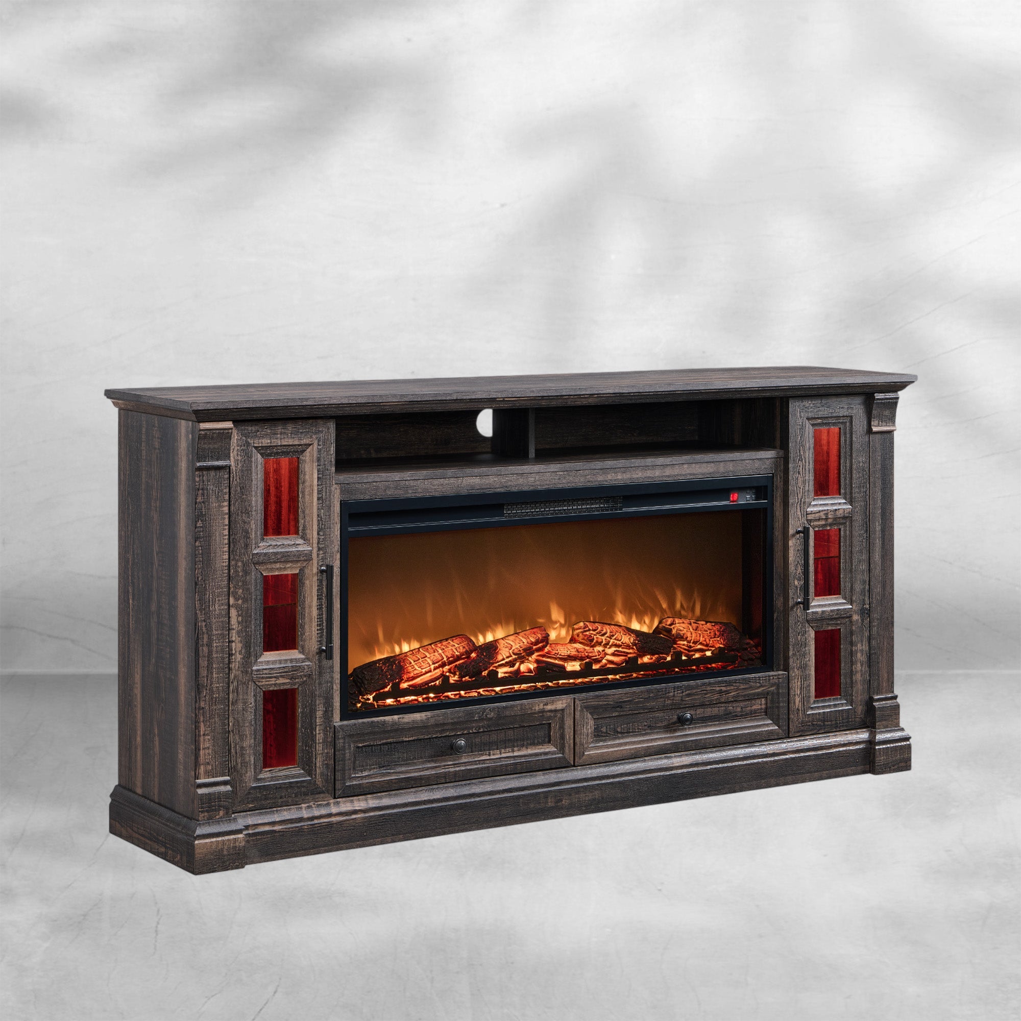 Cozy up your living room with this farmhouse-style fireplace TV stand. Designed to accommodate TVs up to 80 inches, it features a 42-inch electric fireplace to add warmth and ambiance. Glass door cabinets and drawers offer ample storage for media and accessories. The dark rustic oak finish brings a touch of country charm to any home.