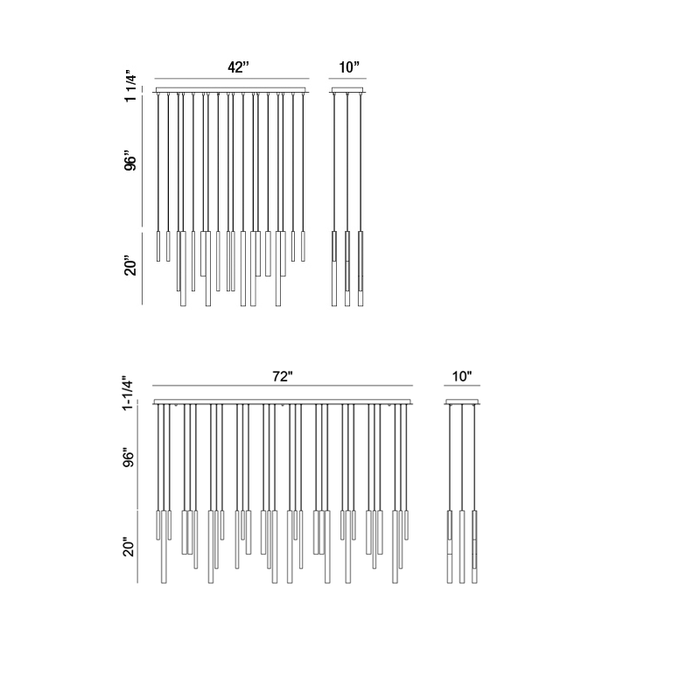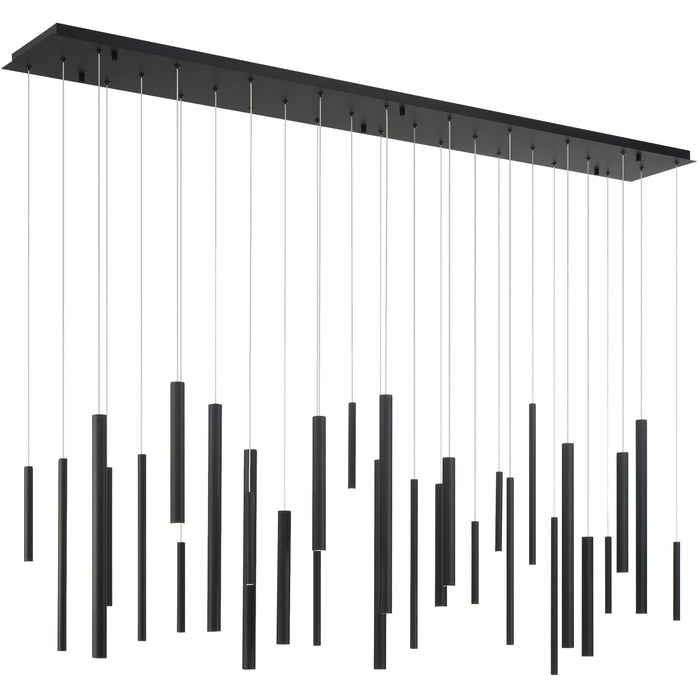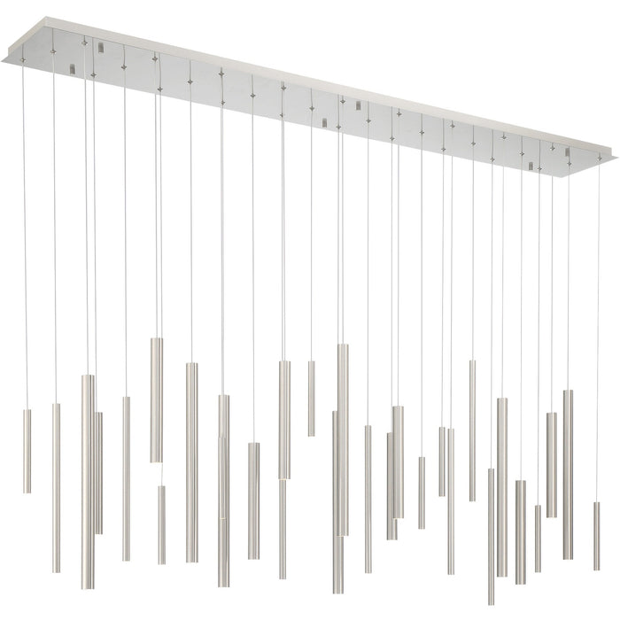 The Santana Linear Multi Light Pendant enhances your space with a sense of dynamic movement, composed of aluminum tubes of varying sizes hung at different adjustable heights. Each tube houses a recessed LED light at the end for collective spot lighting. This dramatic fixture is an ideal centerpiece for modern dining rooms and living areas.