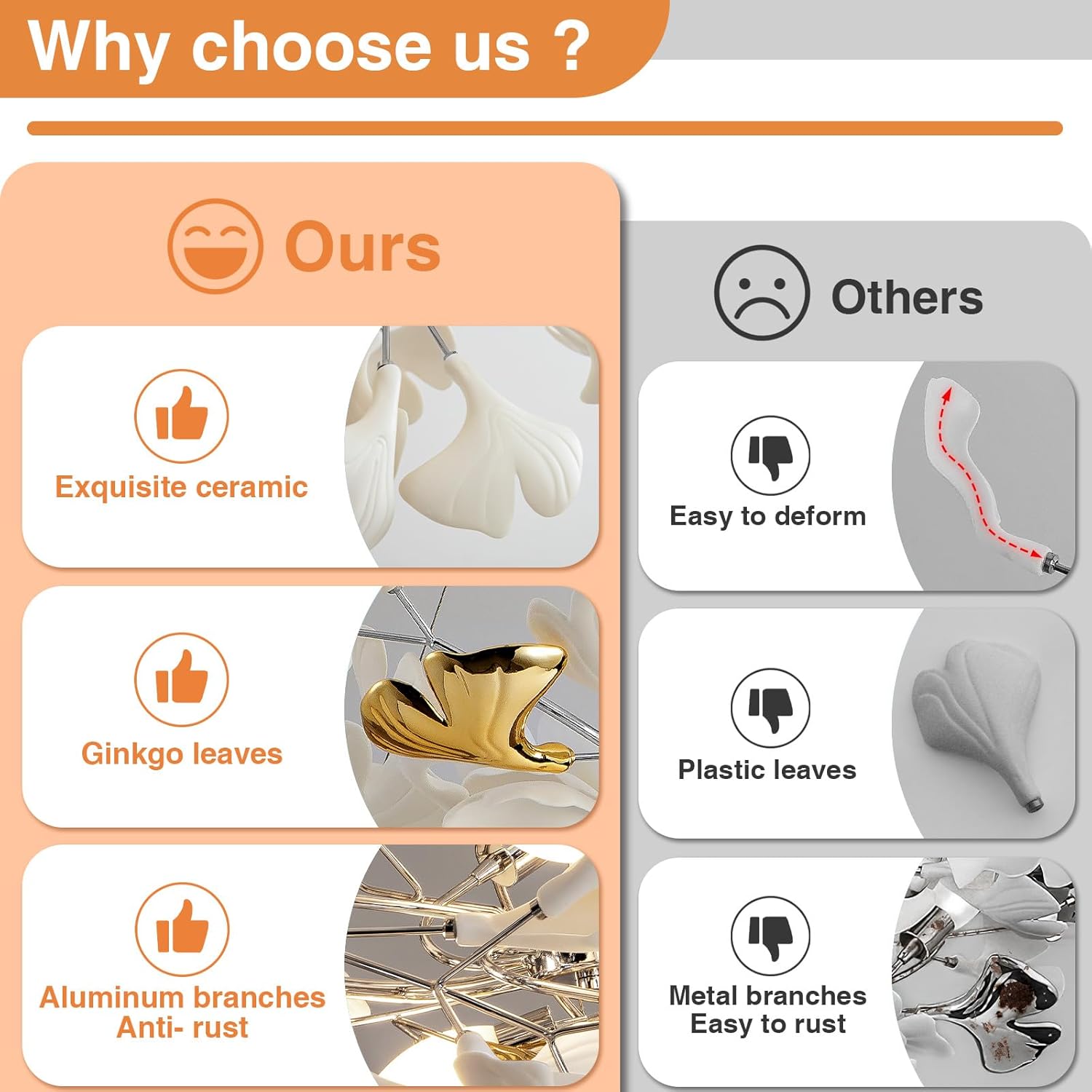 A striking silver chandelier that captures the elegance of a ginkgo tree branch, perfect for dining rooms or grand entryways. Hand‑crafted ceramic leaves add a frosted, gold‑toned finish that glimmers under warm white light. Adjustable brass chains let you set the height from 78.7 inches to fit any ceiling height. The fixture holds six G9 bulbs for a cozy 3000K glow without any included bulbs.