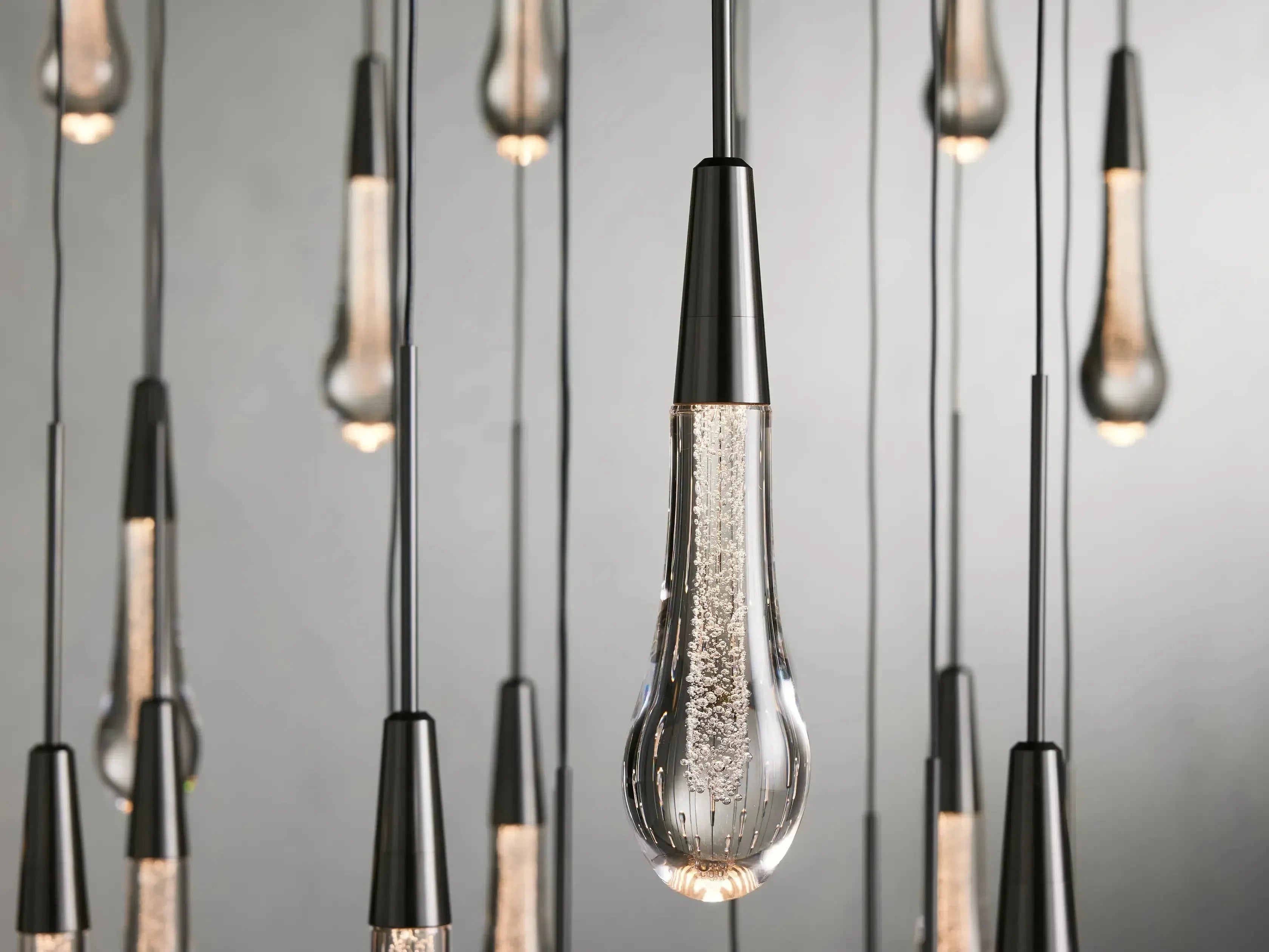 - Featuring adjustable black PVC cords cascading into integrated LED lights handcrafted from seeded glass, our Soltaire Lighting Collection mimics the look of a fallen raindrop.