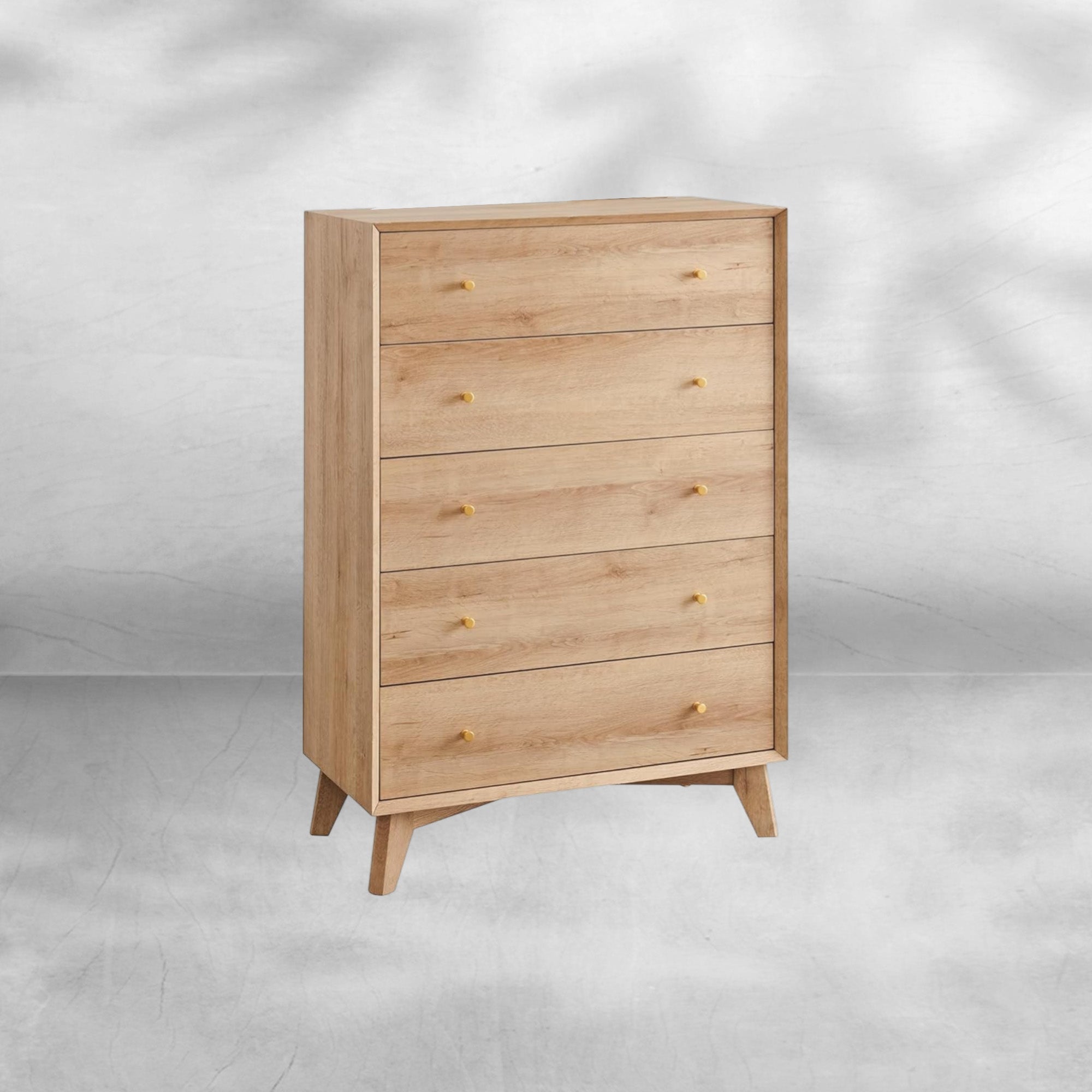 Elevate your bedroom or living space with this stylish 5-drawer dresser! Featuring a beveled profile design and a natural oak finish, this wood drawer organizer adds a touch of mid-century modern charm to any room. It's perfect for organizing clothes, accessories, or household items, while its tall design maximizes vertical storage. This dresser is an elegant and functional addition to your home!