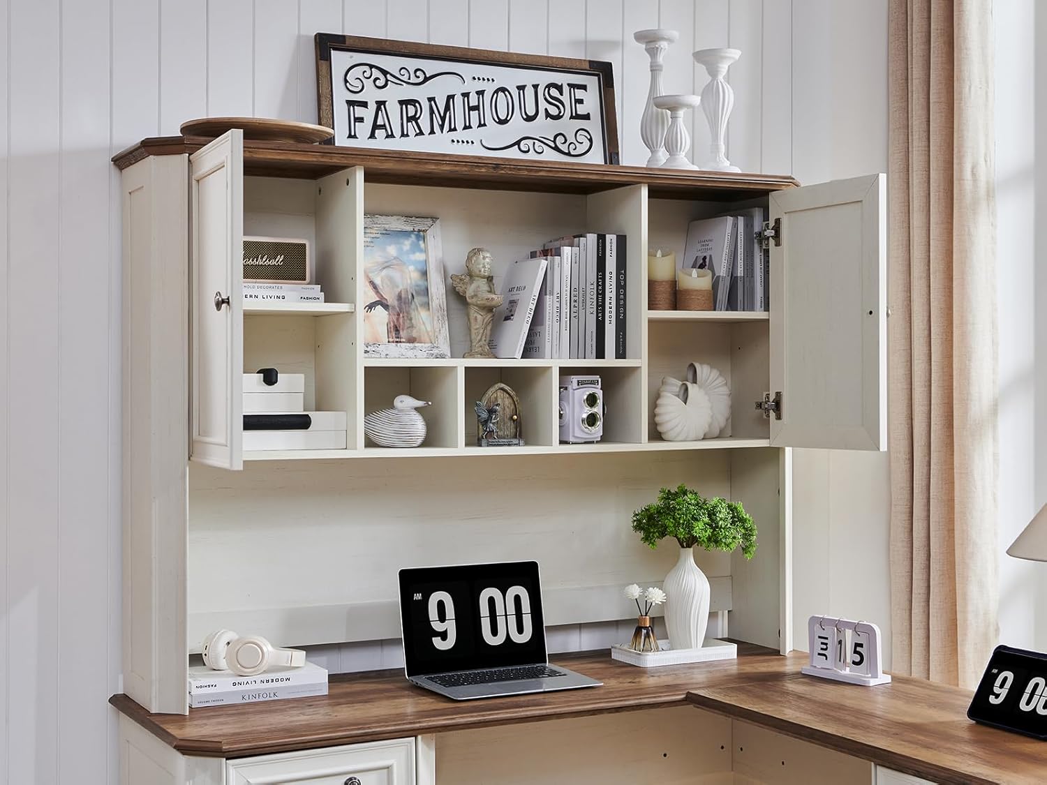 Elevate your workspace with the T4TREAM desk hutch, designed to seamlessly match the JC-VSC Series Farmhouse Desk. Adding valuable vertical storage, this hutch is perfect for organizing books, displaying decor, and keeping office essentials within reach. Its charming antique white finish brings a touch of rustic elegance to any home office. Optimize your desk setup and transform clutter into a stylish, functional display!