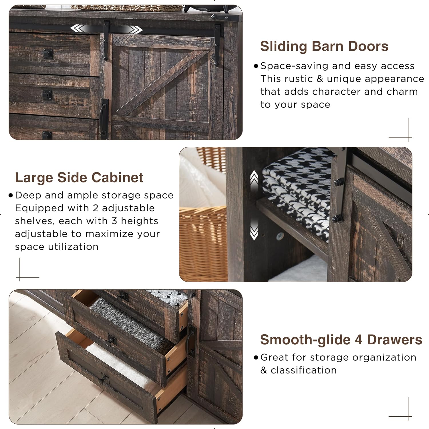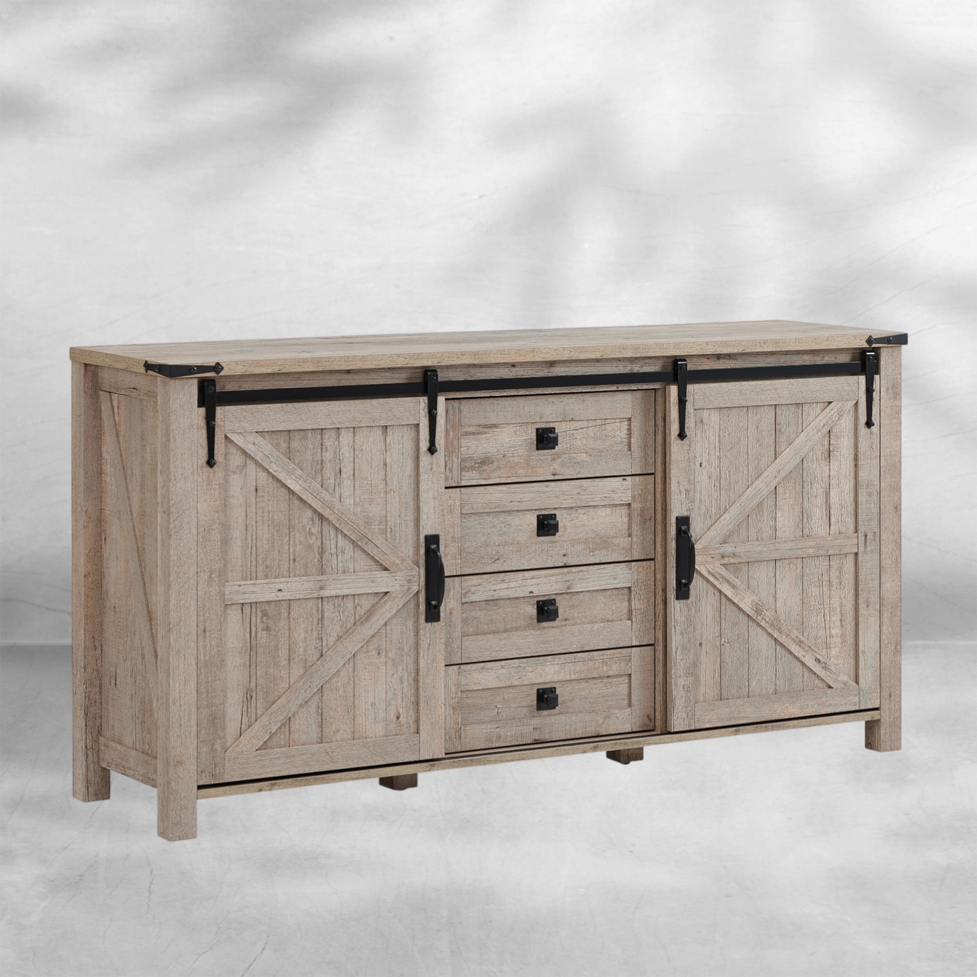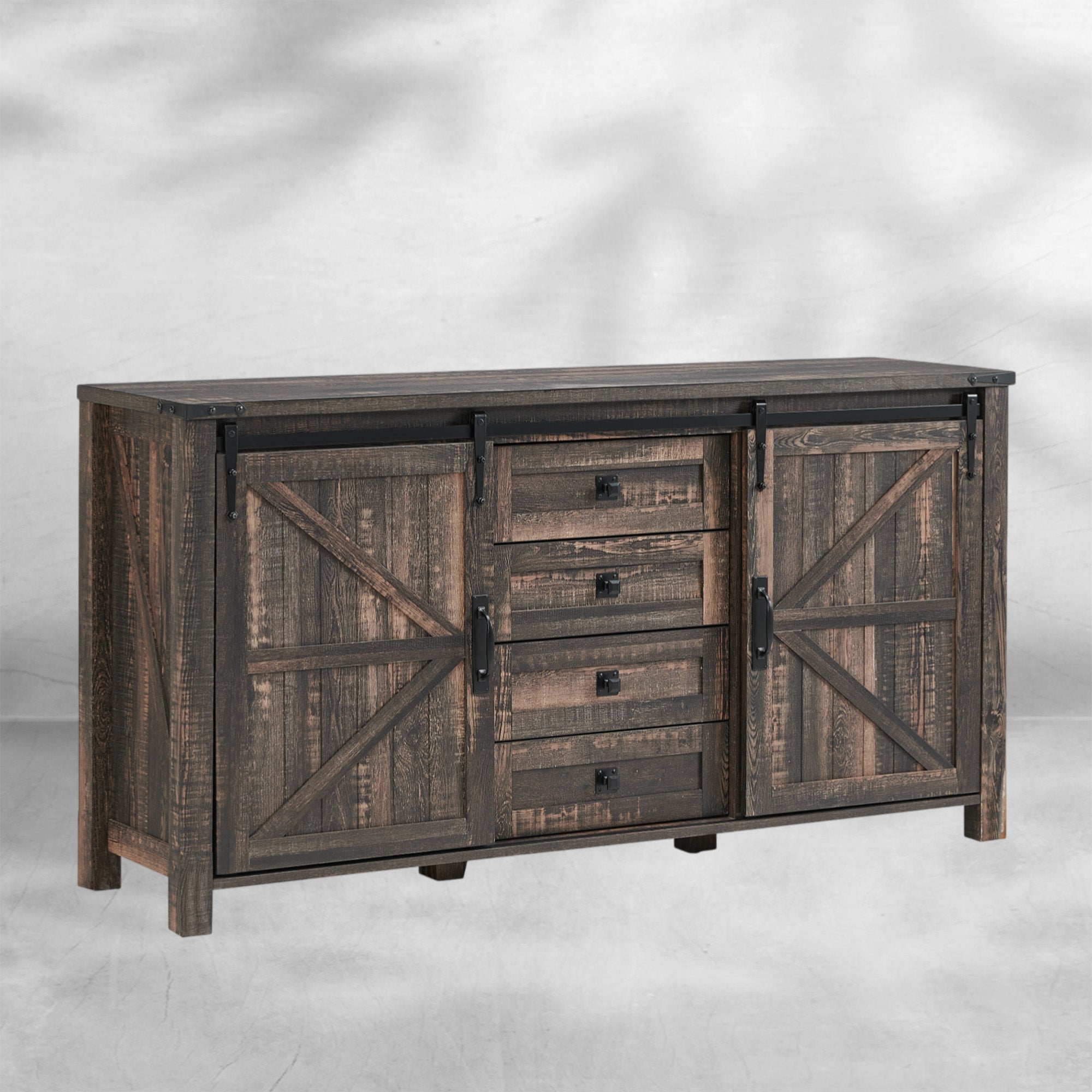Elevate your bedroom or living room with this charming farmhouse dresser. The sliding barn doors add a touch of rustic elegance while concealing and revealing storage as desired. Four spacious drawers offer ample space for clothes and accessories. It can even serve as a wide TV stand for your entertainment needs.