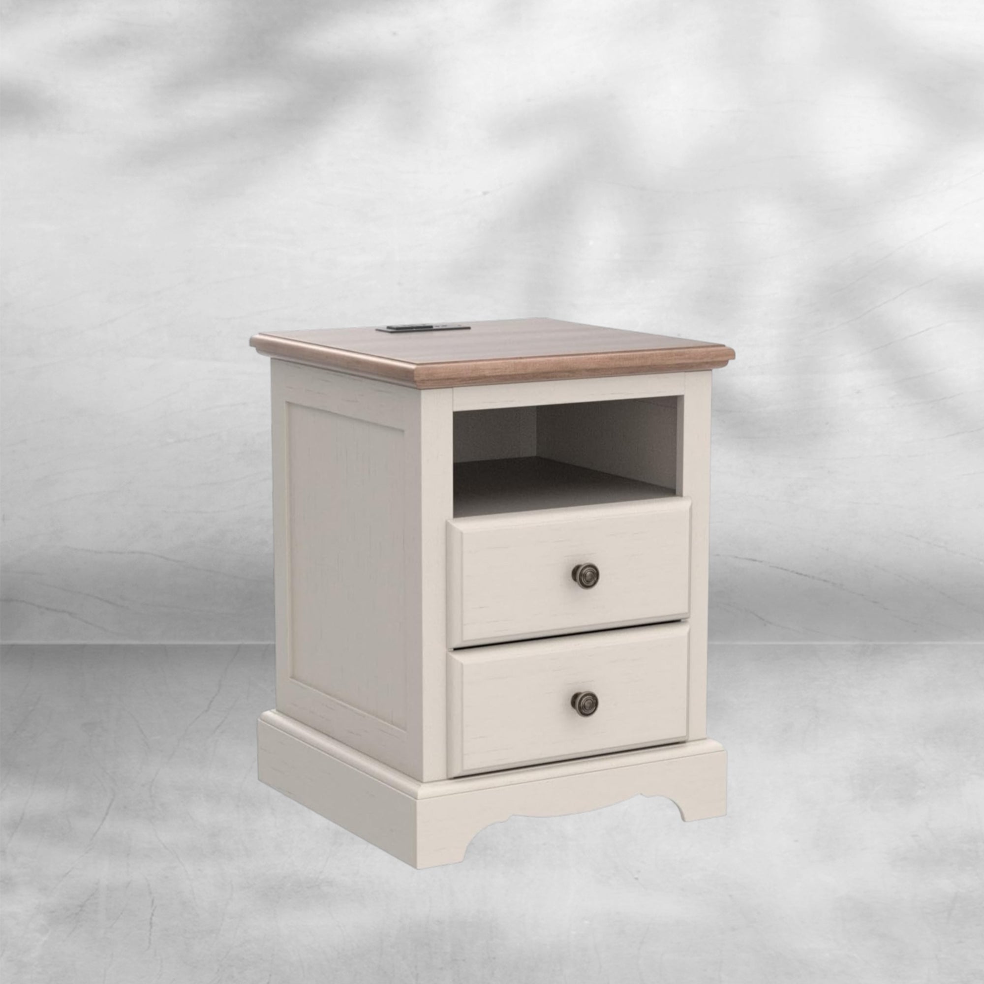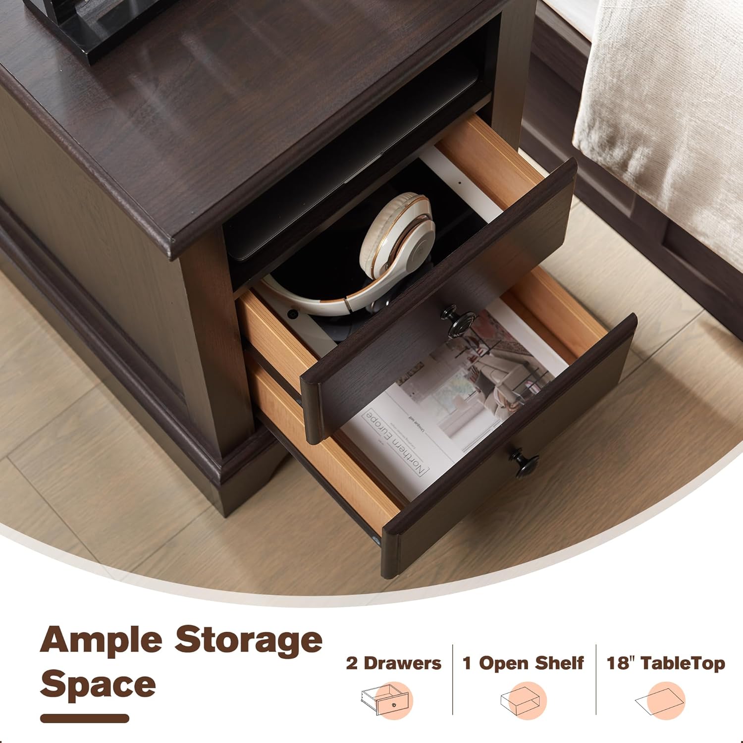 Maximize your bedside space with this vintage end table. Featuring a built-in charging station, keep your devices powered up and ready to go. Two drawers offer concealed storage, while the open shelf provides easy access to books or decor. Its rustic, espresso finish adds a touch of warmth to any living room or bedroom.
