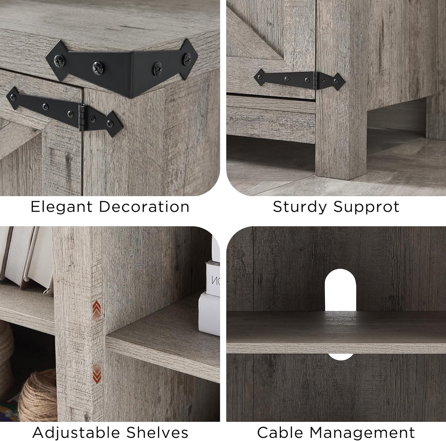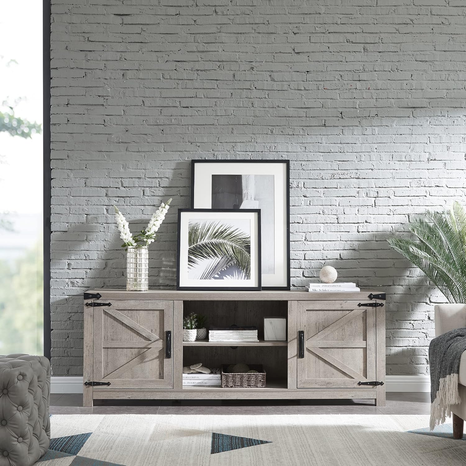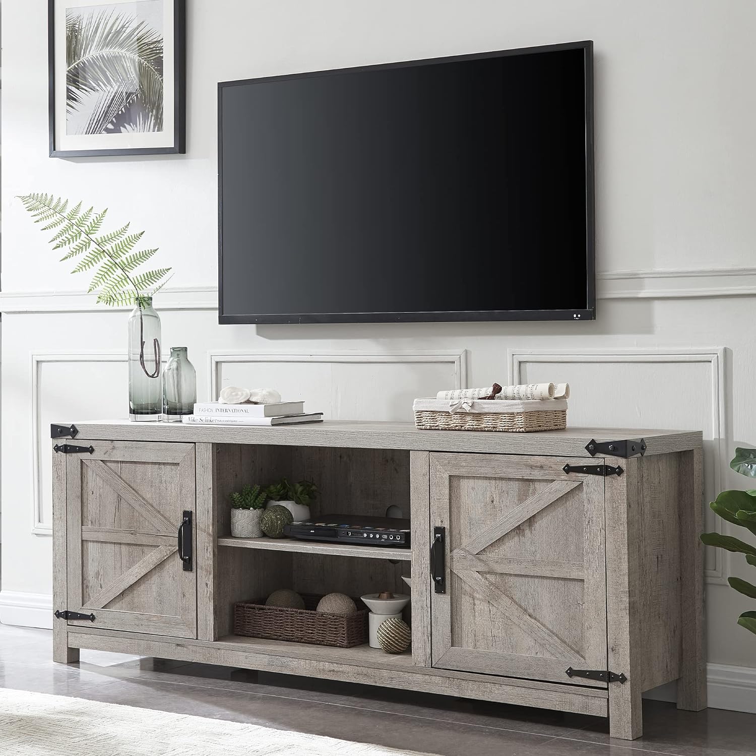 Elevate your living room with this farmhouse-style TV stand. Featuring charming barn doors and a rustic gray wash finish, it accommodates TVs up to 75 inches. The spacious storage cabinets keep your media components organized and out of sight. Easy to assemble, this entertainment center combines modern convenience with classic design.