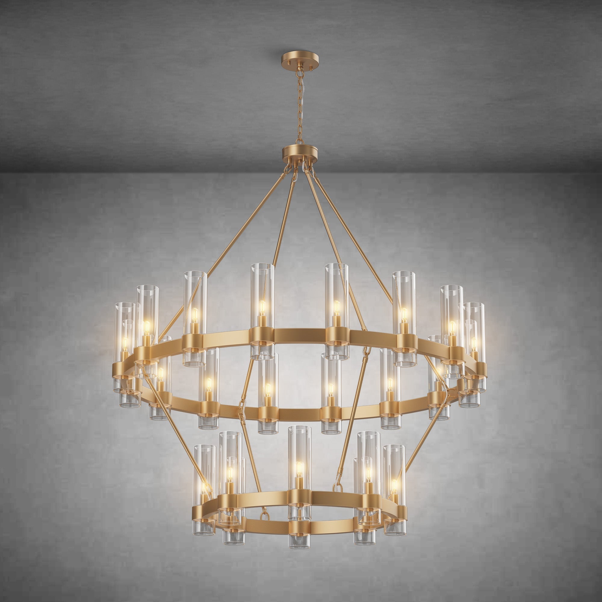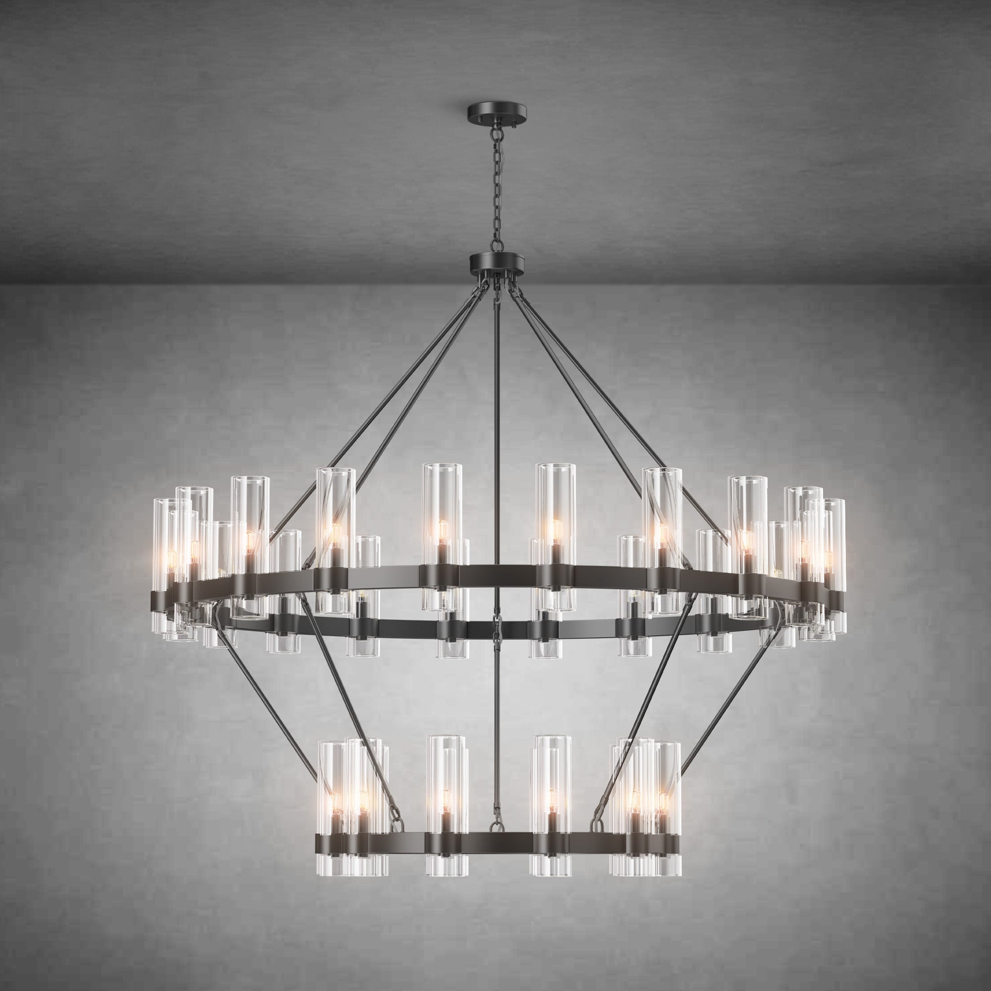 This two-tier wagon wheel chandelier features a solid metal frame with glass shades, designed to provide wide, even 360° illumination. The double-layer circular structure creates balanced lighting and added visual depth while maintaining a clean, structured look.