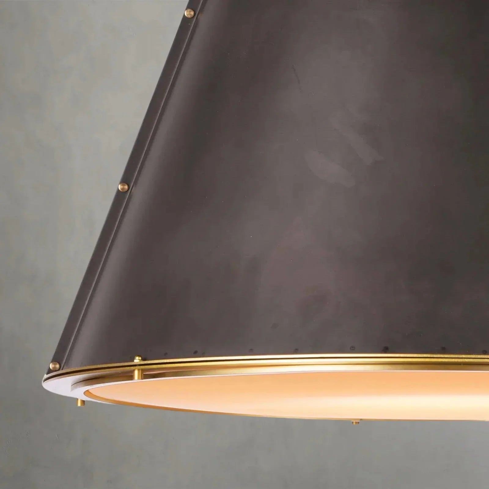 The Vertelle Maid Chandelier features a sleek, blackened natural brass cone silhouette accented with natural brass rings at both the top and bottom. Industrial-style brass studs add a bold touch, while a diffuser shade ensures soft, ambient light, making it perfect for illuminating a kitchen island.