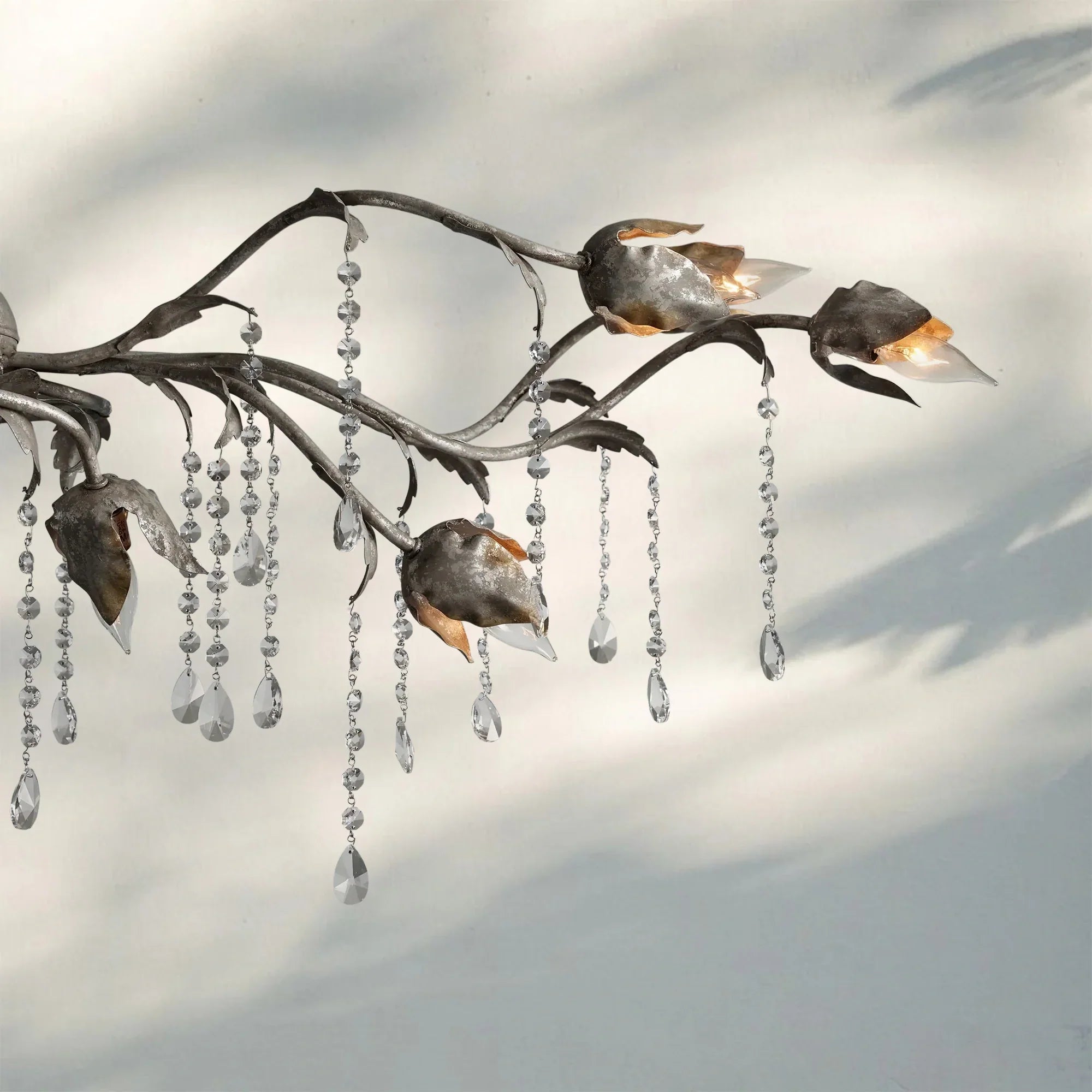 Like freshly fallen rain on draped garden vines, our Viticcia Chandelier is hand-moulded by artisans from solid iron. Floral flourishes are elegantly accentuated by a hand-applied silver finish, and hand-strung crystals dangle to scatter drops of light around your space.